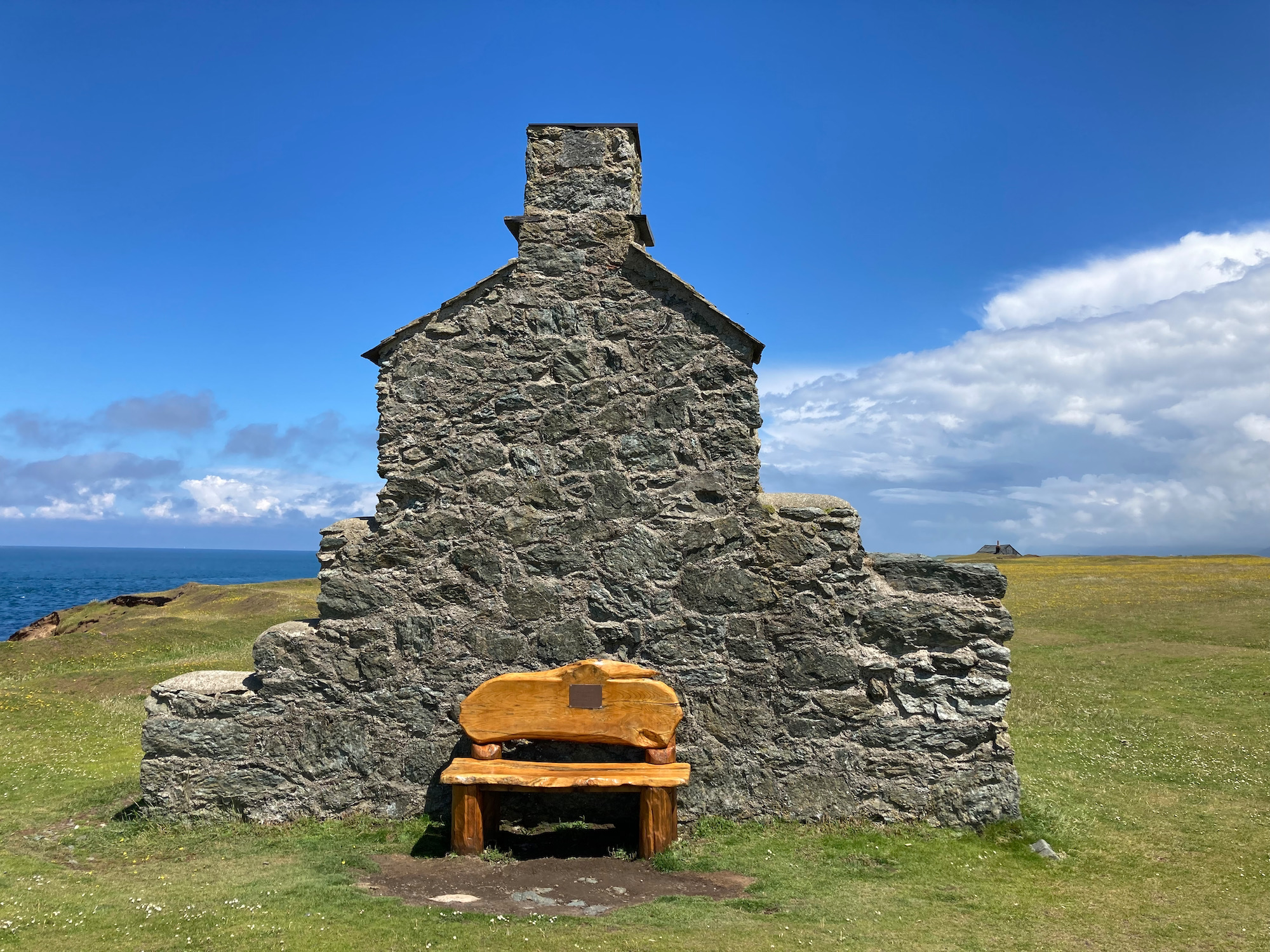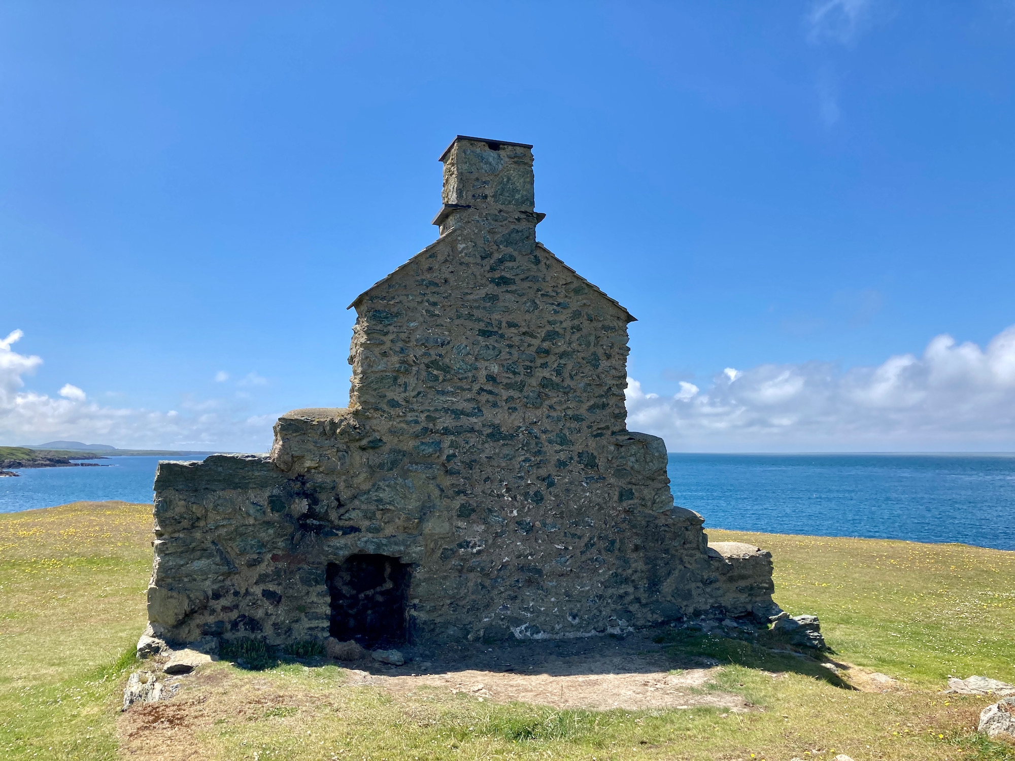 A little later we reach Porth Ysgaden, where the ruins of a small stone built house stands on the headland. I walk off the path to go and investigate, while Damian talks to cows. I later discover that the sole wall standing is the gable end of the old coastguard’s house. On one side a carved wooden bench has been placed and on the other side the blackened stones point to the position of the old fireplace.