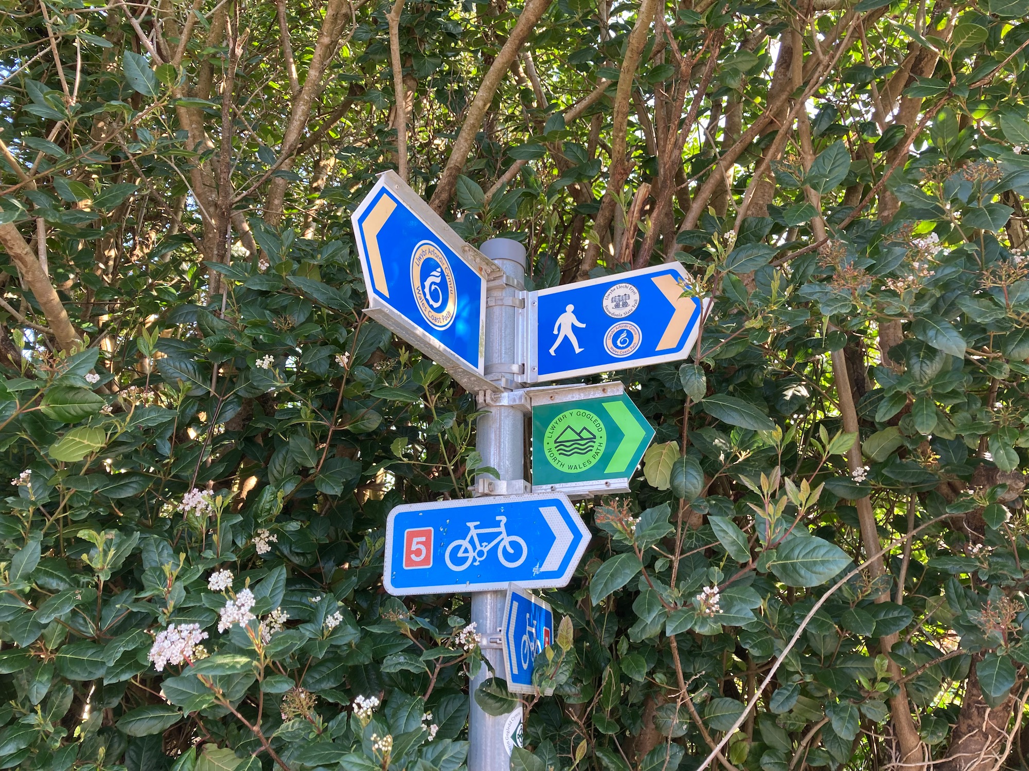Retracing our steps across the bridge we spy the cheery coast path signpost which leads us through a stone arch, over another bridge and onto a peaceful tree-lined path where the only disturbance is the occasional cyclist.