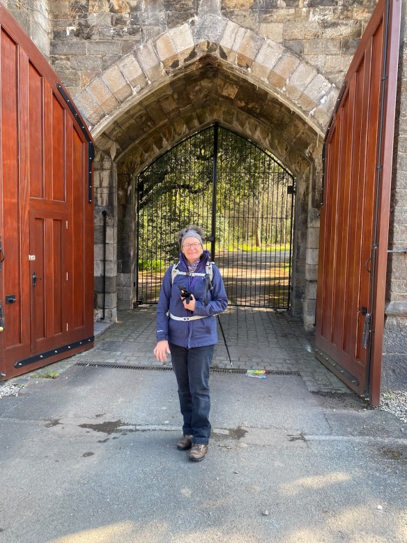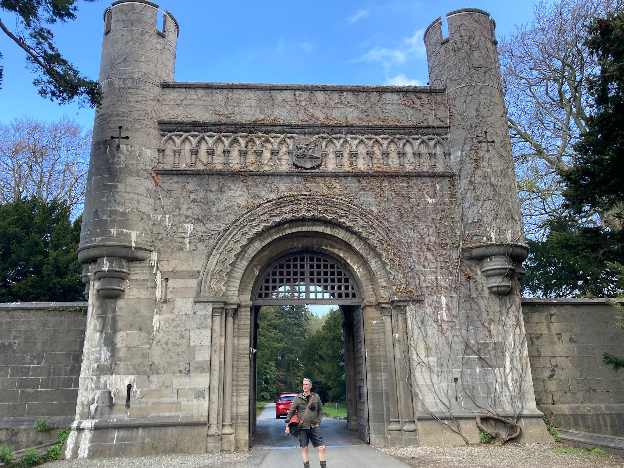 Out of the pub we follow the main road back in the direction of the coast. At one point we walk past what I think is the main entrance to Penhryn Castle – a photo opportunity.