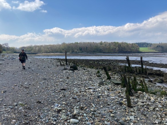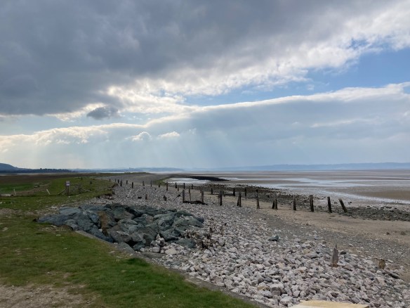From here the path now hugs the coastline on a grassy path and occasionally right along the stoney beach. On a grey day this could be rather bleak – a dark marshy shoreline dotted with rotting groynes, but in today’s intermittent sunshine the vast expanse of mud and sand and the mountains off to the right have their own beauty.