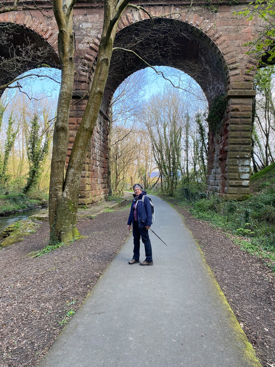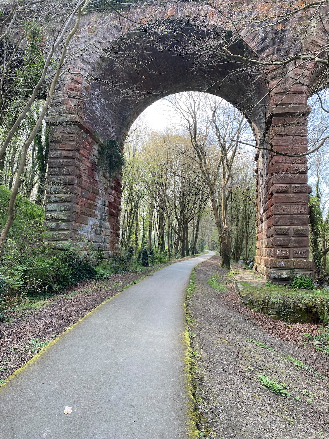 It is a beautiful morning and we are now sheltered from the wind by woodland on both sides of the path – a small river can be seen through the trees off to the right. At one point the tall arches of an imposing red brick bridge spans the path. Further research tells me that this is a well-preserved example of an early railroad bridge, built between 1798 and 1800 to carry the Penrhyn railroad over the lower reaches of the Afon Cegin (the river). It is likely that the Cegin Viaduct is the oldest known multi-arched railway bridge to survive above ground in Wales and possibly the world. The precision and symmetry of the brickwork are astonishing.