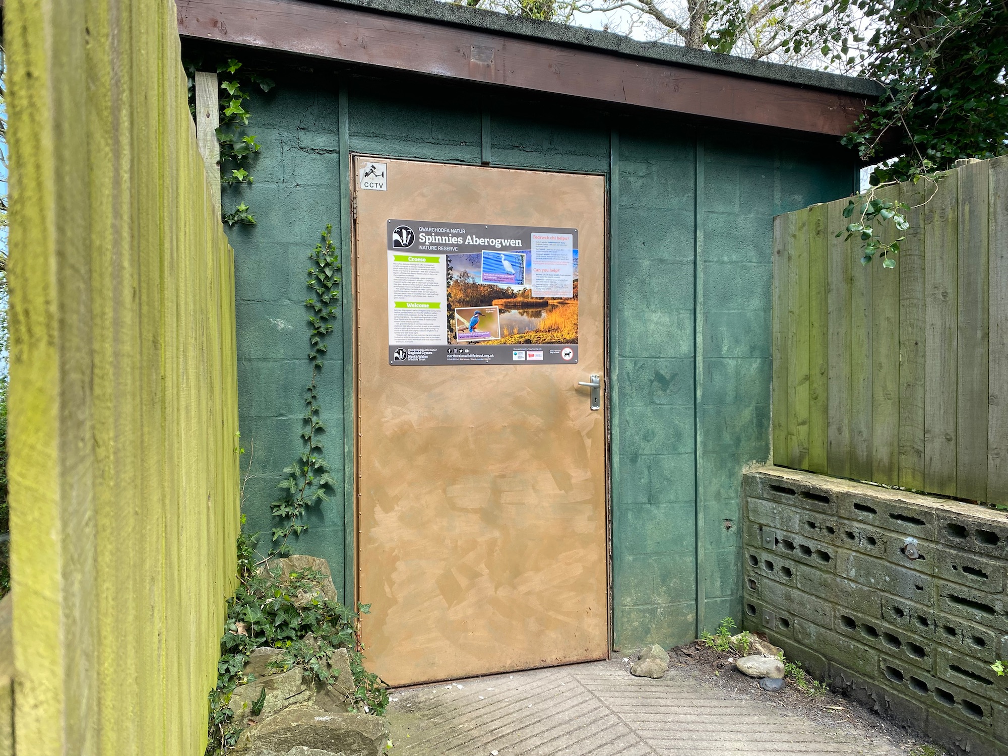 We now follow a quiet road, still skirting the stone walls of the Penhryn Estate until the map indicates a turn off into a small nature reserve called The Spinnies. At the entrance to the path is a very strange looking gate which Damian has to investigate.