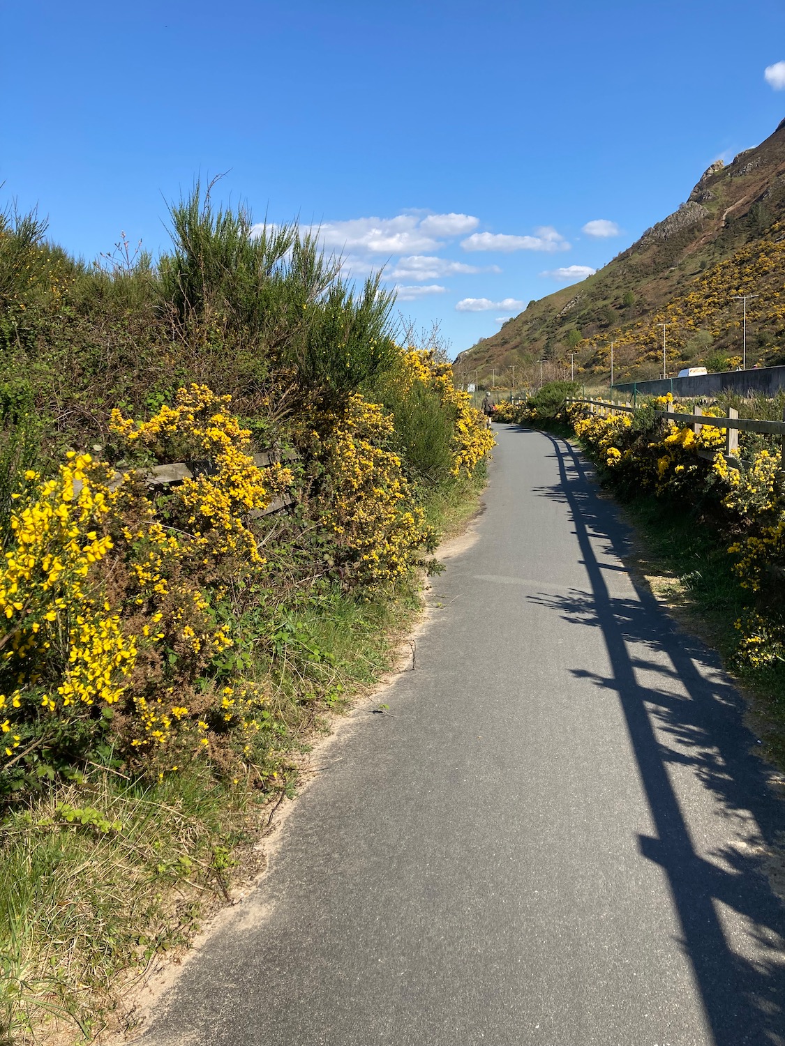 Anyway, we have lost a bit of time taking the long way round and it is getting very hot. We trudge along on a cycle route besides the road – my mood momentarily lightened by rows of flowering pine trees and gorse bushes