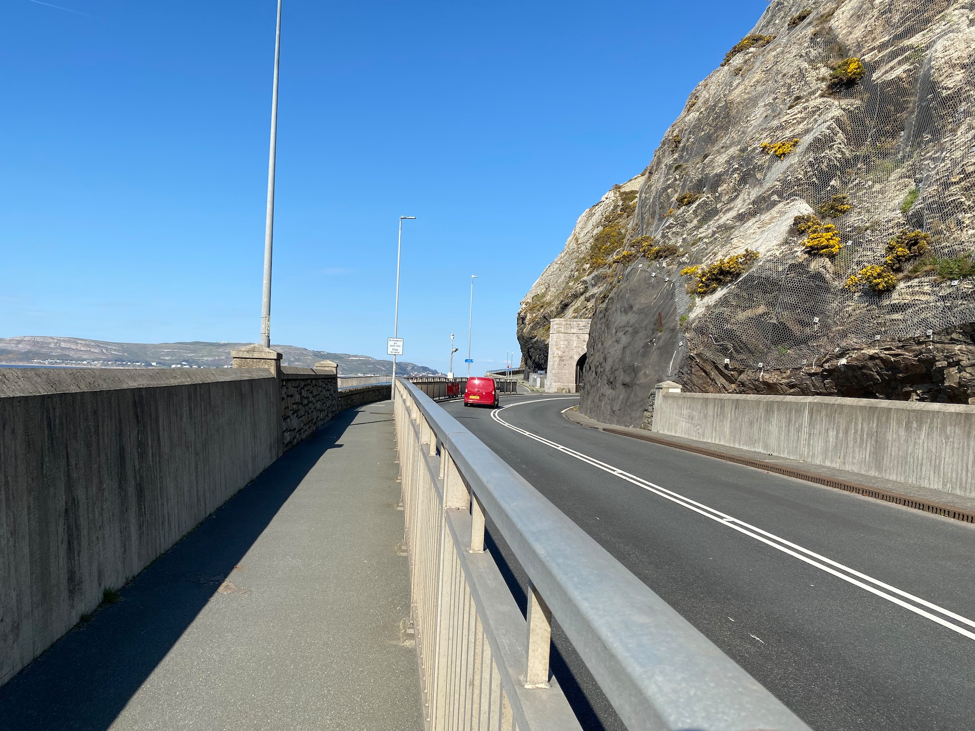 At some point even that joy is taken away as we approach a road tunnel that cuts through the hill known as Penmaenmawr Bach. My heart sinks when I see the tunnel as I can’t see any way for us ordinary mortals to get around it but to my great relief I then spy a cycle route sign and a narrow lane curling up and around the face of the cliff. I think you can see the traces of worry on my face in the picture.
