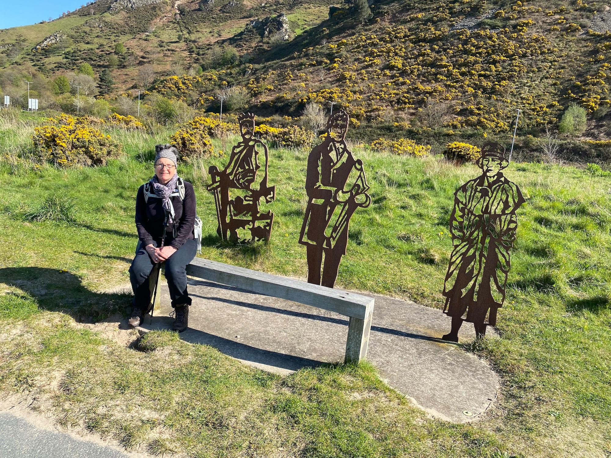 Just before we start walking along the beach we find a seat and some metal statues where we take a well earned rest. Later I find out that the steel statues represent (from the left) Llewelyn The Great Prince of Gwynedd, Thomas Telford Civil Engineer and Margaret Williams Local Journalist and Author.