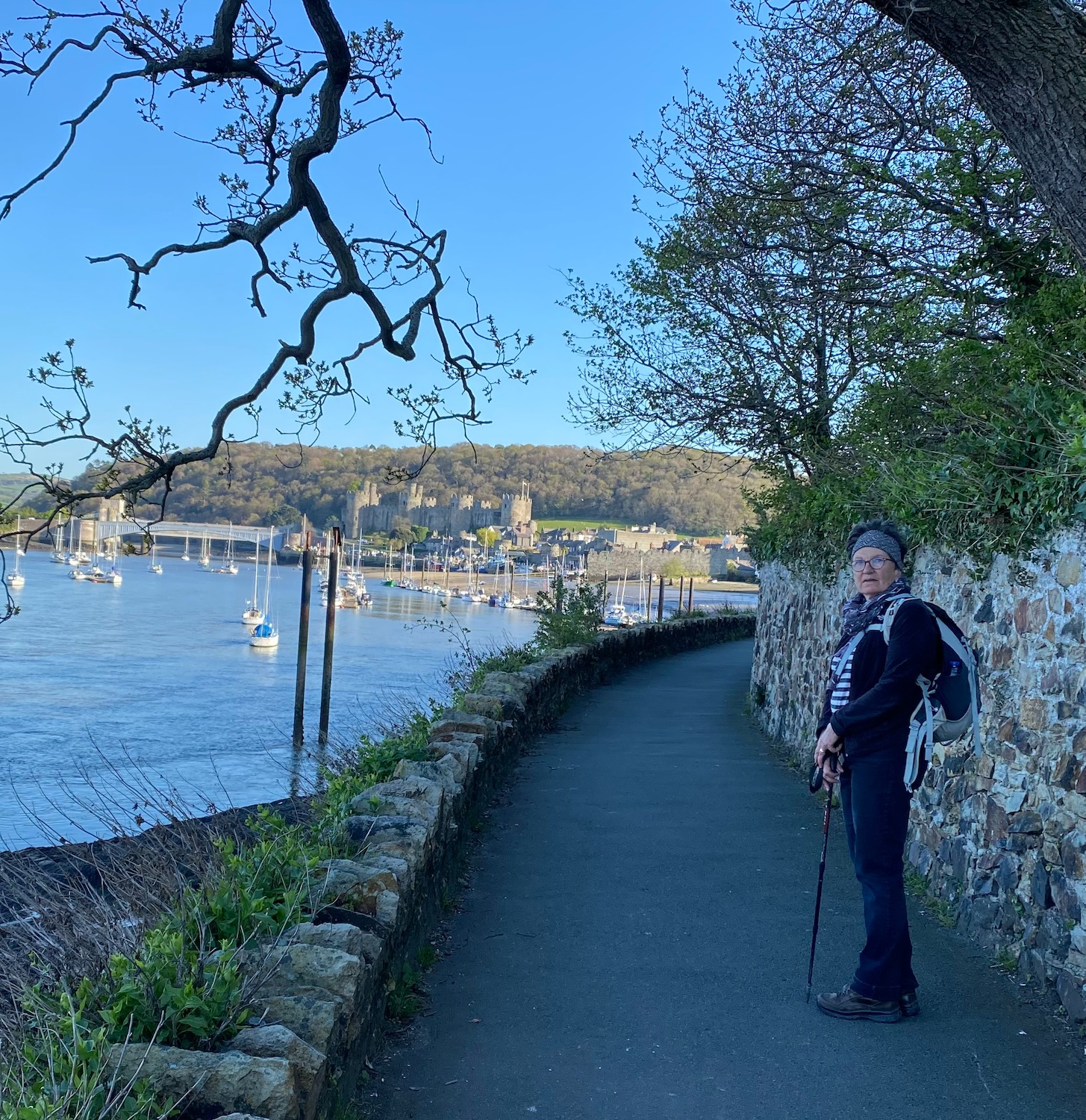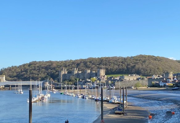 After the hard thump of tarmac and concrete it is a pleasure to walk on the beach, even if it is stoney, which curves around and up the estuary of the Afon (River) Conwy. We walk past the affluent looking marina and into the town, where we follow the path around an unexpected patch of woodland encircled by stone walls, to our first sight of Conwy Castle.