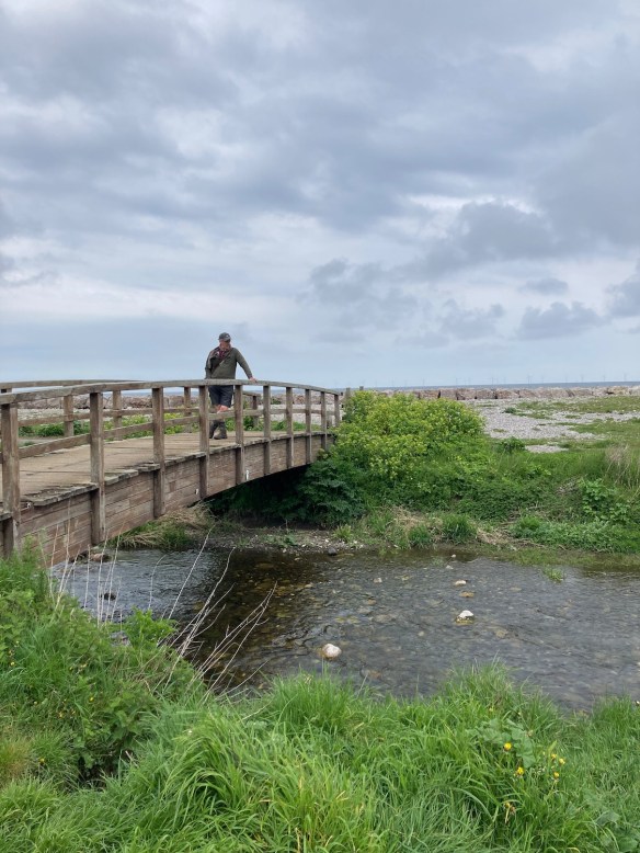 The path continues as expected along the shore but instead of tramping along the concrete sea wall we opt for the grassy bank that runs parallel. Over to the left a seemingly unending row of caravans stretch out into the distance. It is chilly as you can see – gloves and hat in April.