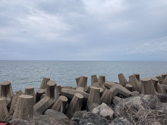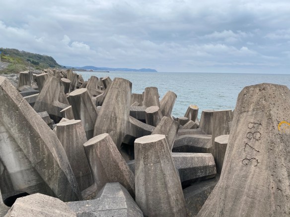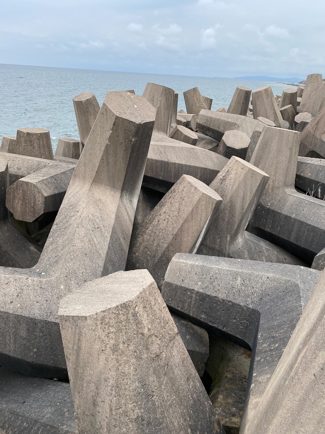 A little further on we meet some very sculptural sea defences – they look like concrete anchors tipped on to the shoreline and remind me of the game of jacks we used to play as children. They are also individually numbered. Did this make it easier to position them? Who knows.