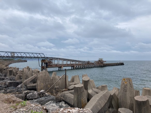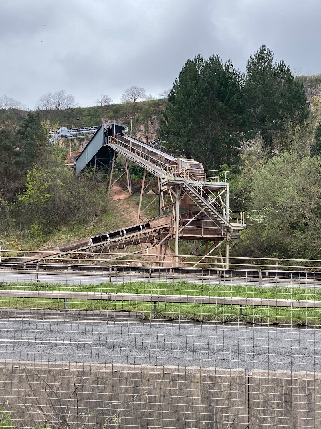 As these strange shapes peter out we reach what looks like a derelict per but is in fact a jetty for a working quarry. Limestone from the quarry on the other side of the A55 is fed down to the jetty to be transported by coastal freighter to other parts of the UK.