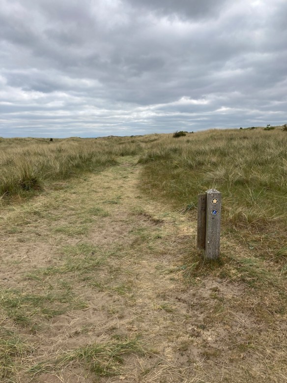 The path soon climbs up from the beach onto a boardwalk which winds its way through the dunes but then peters out into rough grass. That small figure you can see on the skyline is Damian who walks faster than me and very rarely looks behind him to see if I’m still there. The only time I do overtake him is when he stops to talk to sheep or cows or any other animal that will listen.