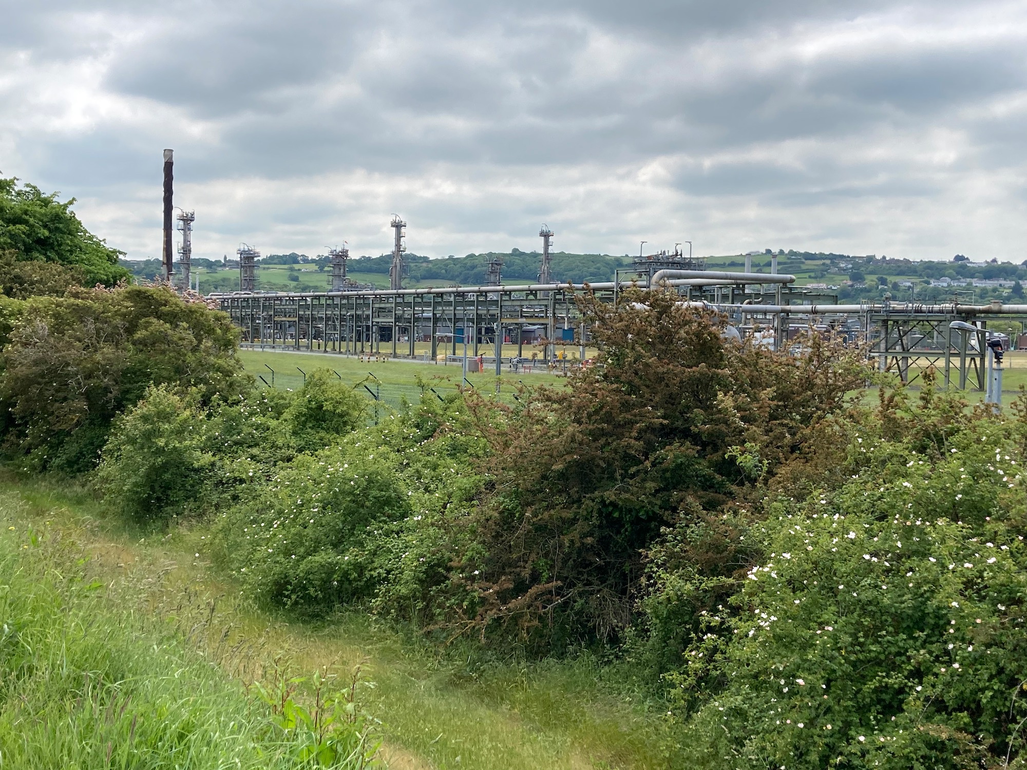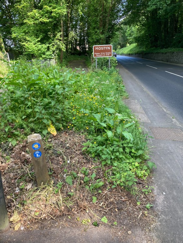 Further up the way we meet our old friend again, the A458 where there is a bit of road walking to do. There are no pavements here but fortunately there is a leafy path running parallel to the road. Not for long however and we’re soon forced back onto a narrow pavement which runs alongside the industrial buildings of Mostyn Dock.
