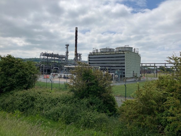 From the lighthouse we turn right to follow the bank of the River Dee. On our left are marshes and to the right a large gas terminal. We read an information board which tells us not to be alarmed if we see flames shooting out of any of the chimneys – it’s just excess gas being burned off – à la Putin.
