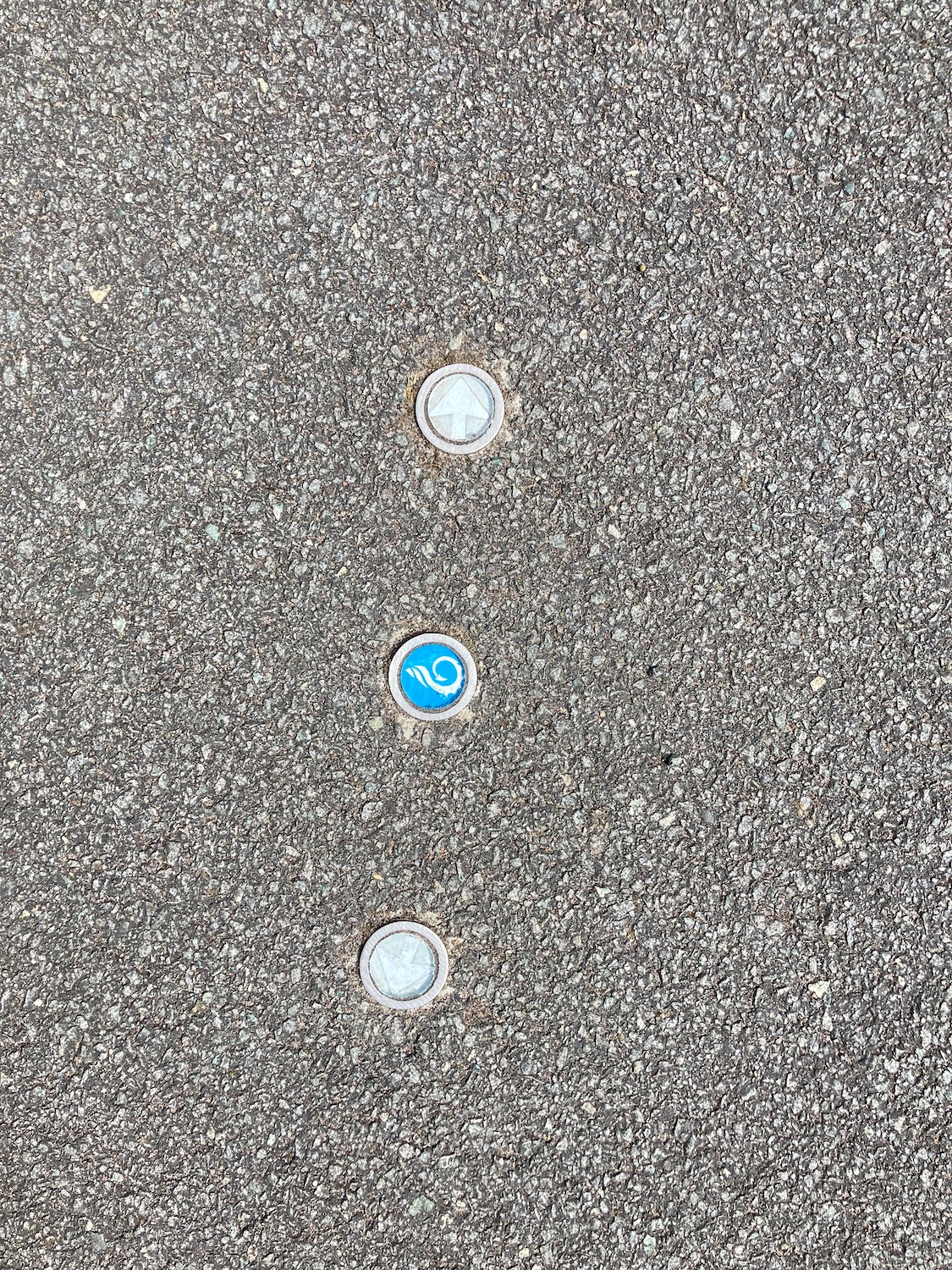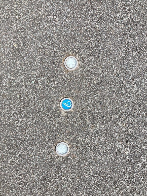 Crossing the A548 we follow the path onto a minor road through a village called Fynnongroyw. I usually pride myself on being able to pronounce Welsh place names but this one beats me. In the village we again cross over the main road and onto a tarmac lane where I see these delightful way markers embedded in the tarmac. The symbol of the Welsh Coast Path is still clear but the arrows have faded – we see them again at another stage in the walk where some louse has dug out the middle one.