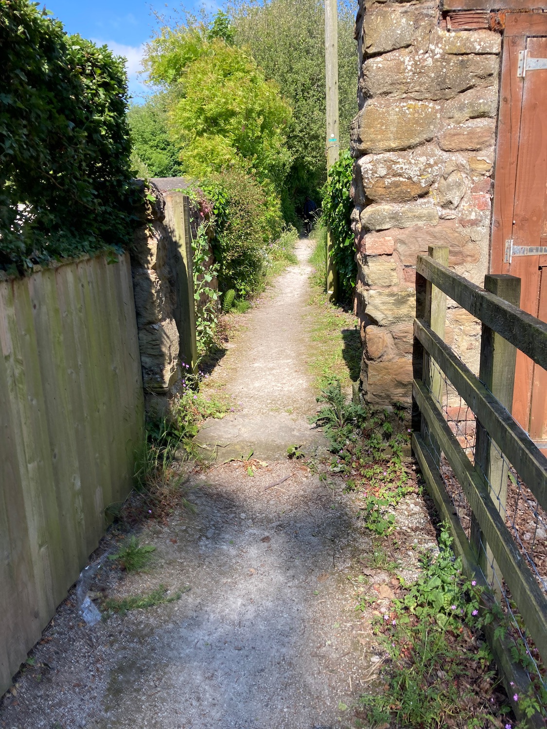 In the town we wander around looking for the path that will take us back to the coast – and there it is, wedged between two houses – easy to miss.