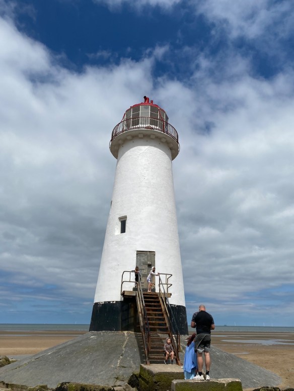 Struggling on soft sand we slowly trudge towards the headland known as the Point of Ayr. To mark the spot is a battered old lighthouse with a slight lean. Built in 1776 it housed two lights, one directed towards Llandudno (west) and the other directed up the Dee Estuary. It is a handsome thing.