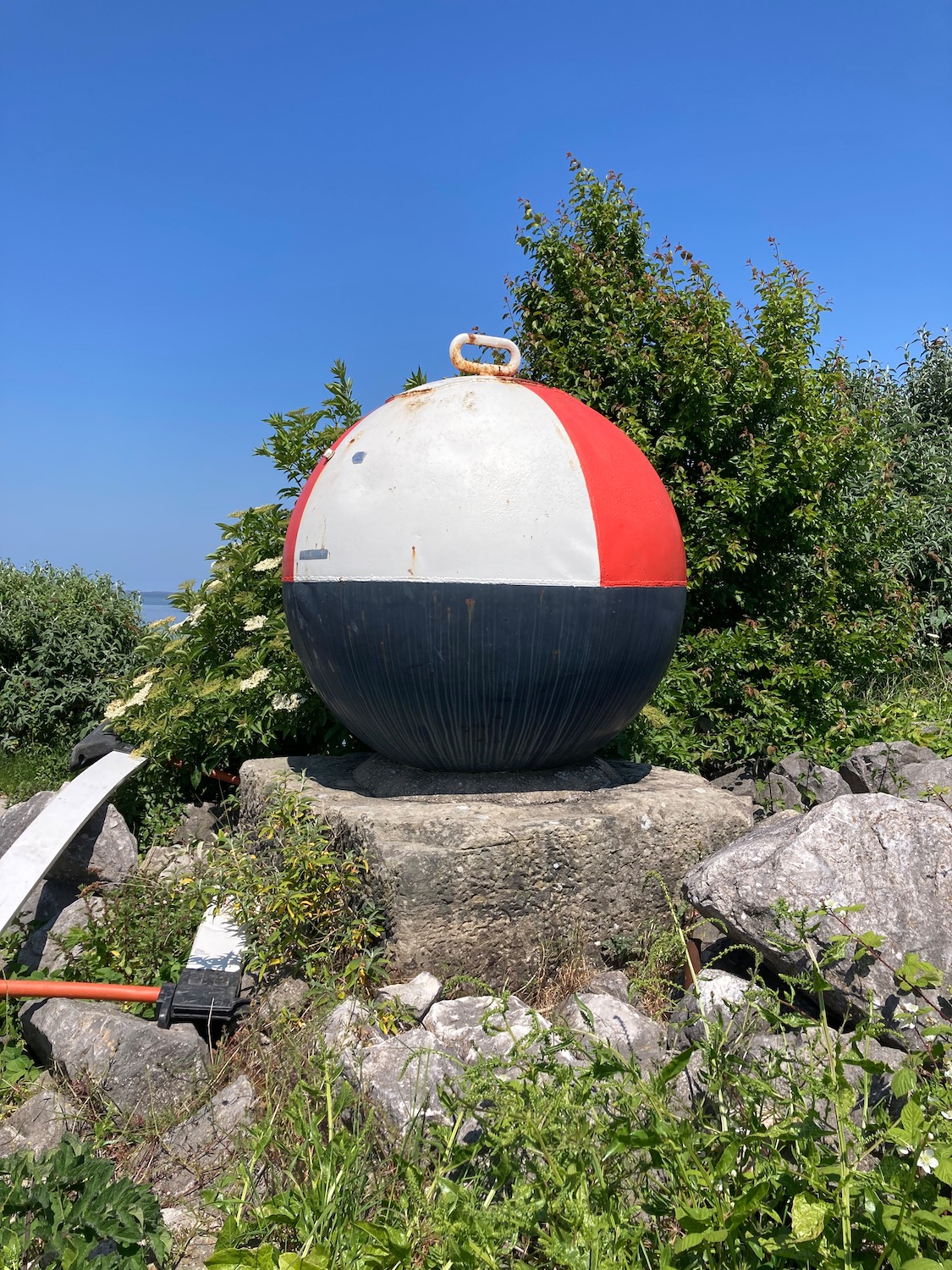 On the far side of the dock, a rusting buoy perches on its granite pedestal…..