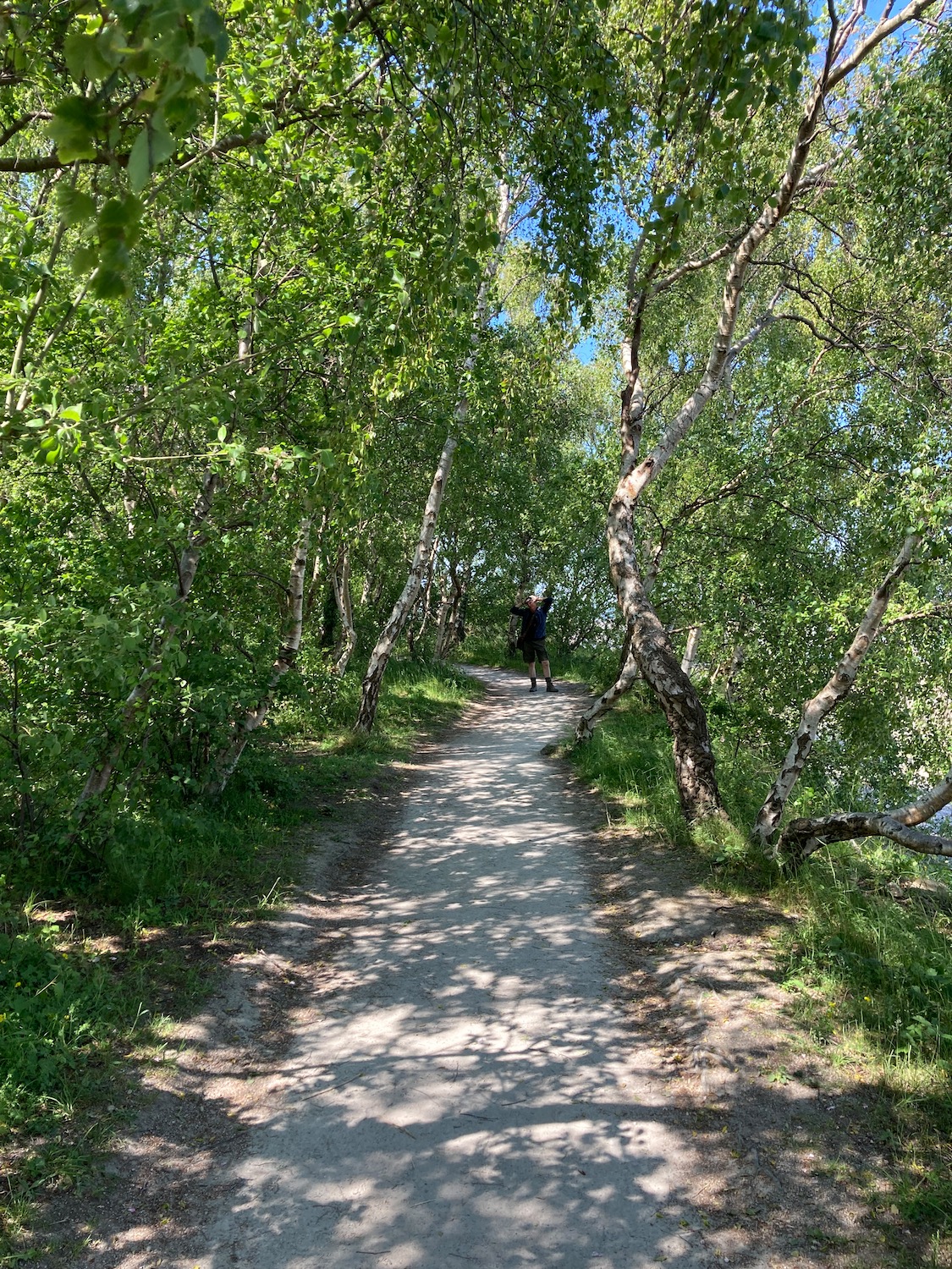 We follow a chalky white path around the right hand perimeter of the castle into a beautiful shady allé of silver birch trees.