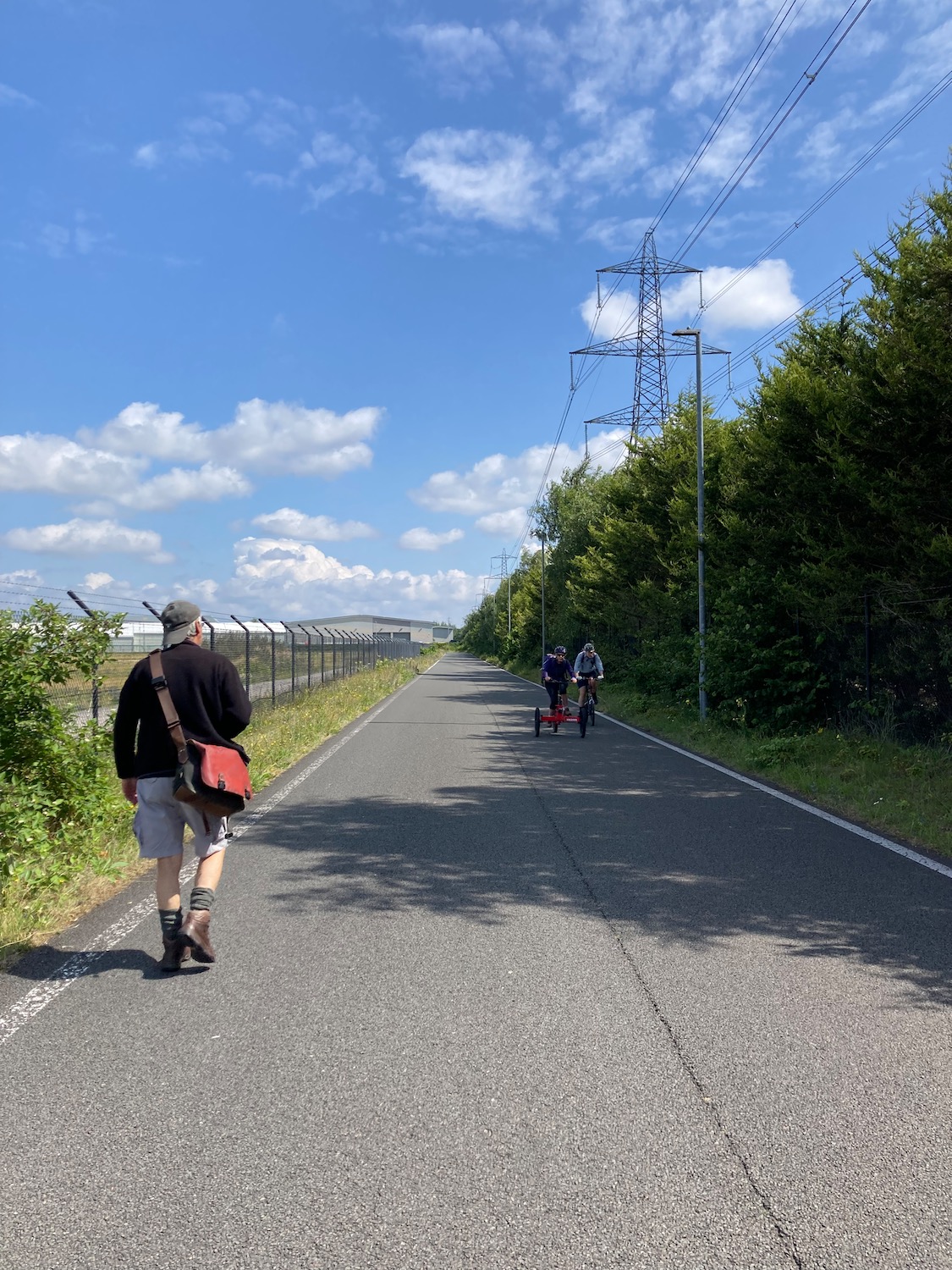 We walk down leafy lanes for a while until the path widens, running past an area of industrial buildings – most of them owned by Toyoto.