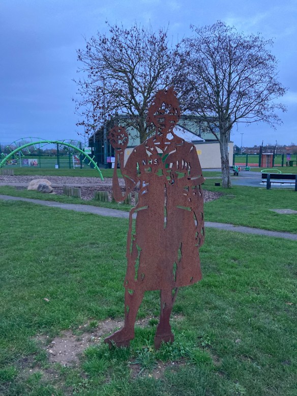 Onward ever onward we somehow manage the next three miles to the outskirts of Kings Lyn where we are very grateful for a footpath leading into the town. A homage to those working in the NHS stands sentinel in a children’s playground.
