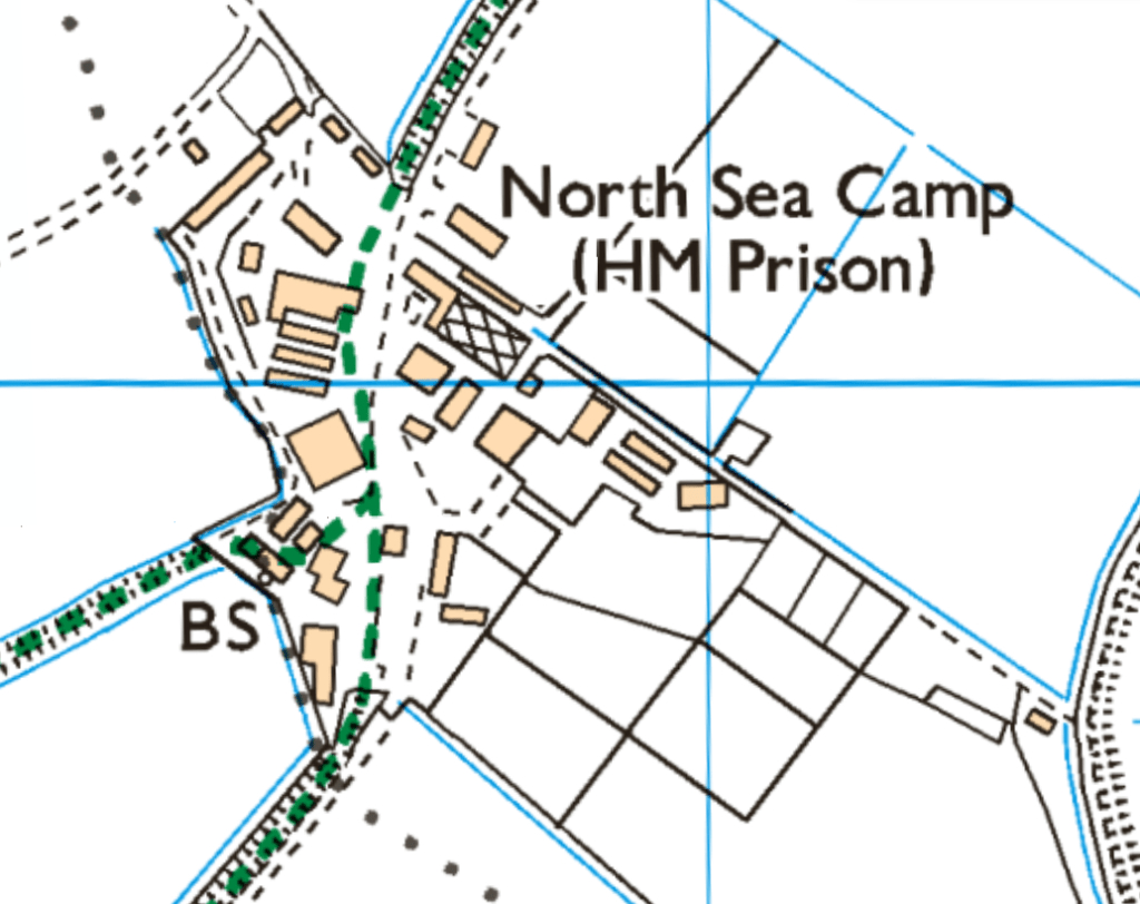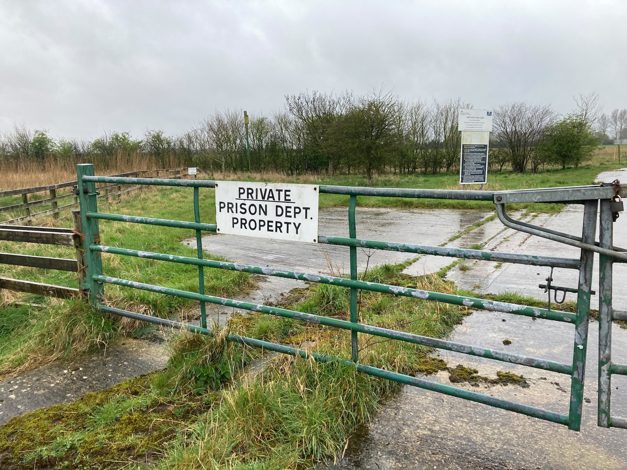From here we set off south down a concrete track with flooded fields to either side. There are a few locals out walking dogs so we take the opportunity to ask them for their thoughts on access to the North Sea Camp Prison, which we know is right up ahead. On the map the public footpath is clearly marked as going right through the camp, but the people we ask are quite adamant that it is not possible.