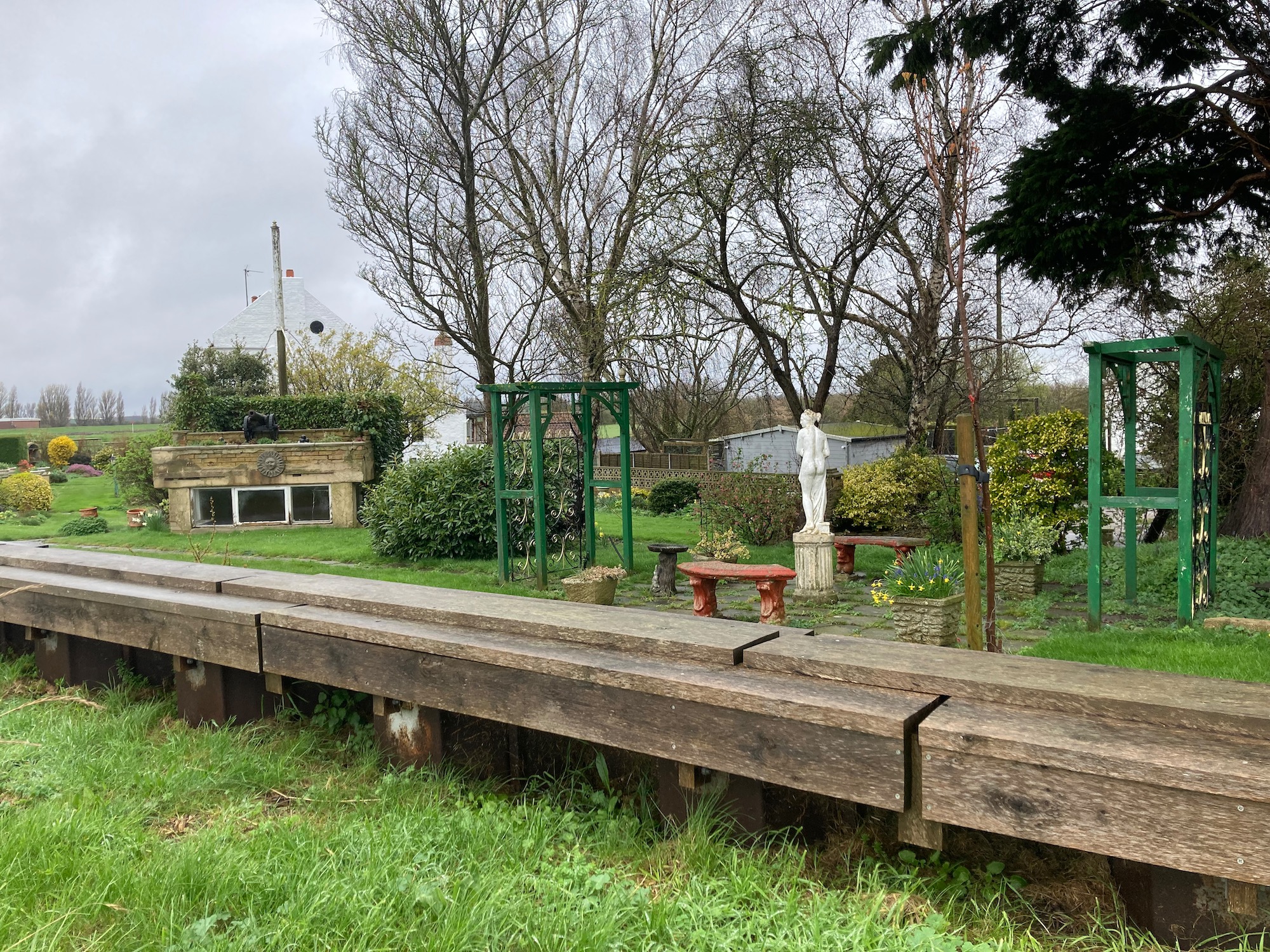 Soon the path reaches the river at a place marked on the map as Cut End cottages, perched very close to the river bank – the cottages are protected by wood and steel piles to ward off flooding.