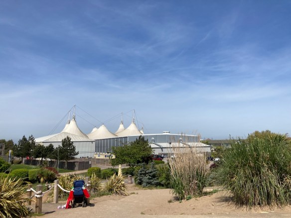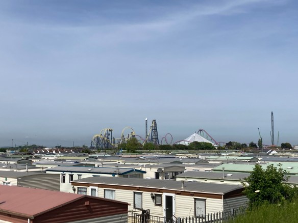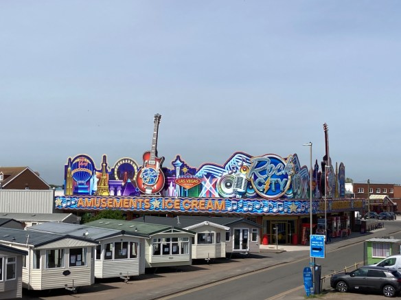 Just before the village of Ingoldmells, we pass the entrance to the first ever Butlins holiday camp, which was opened in 1936. Acres of static caravans and apartment blocks live in the shadow of giant fairgrounds and entertainment malls – these tent like structures house a massive indoor pool with high speed flumes and slides. The website describes it as “3000 meters of fun” Hmmmmm…..