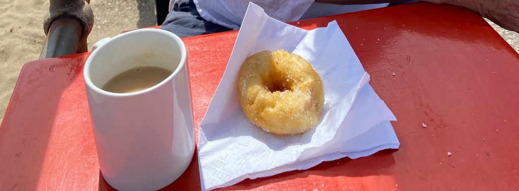 By now it is time for a snack so we stop at a cafe on the promenade and eat freshly cooked doughnuts and tea. I very rarely allow myself to eat a doughnut but I did make and sell them from a stall at Strawberry Fair in Cambridge many years ago. They are delicious…….