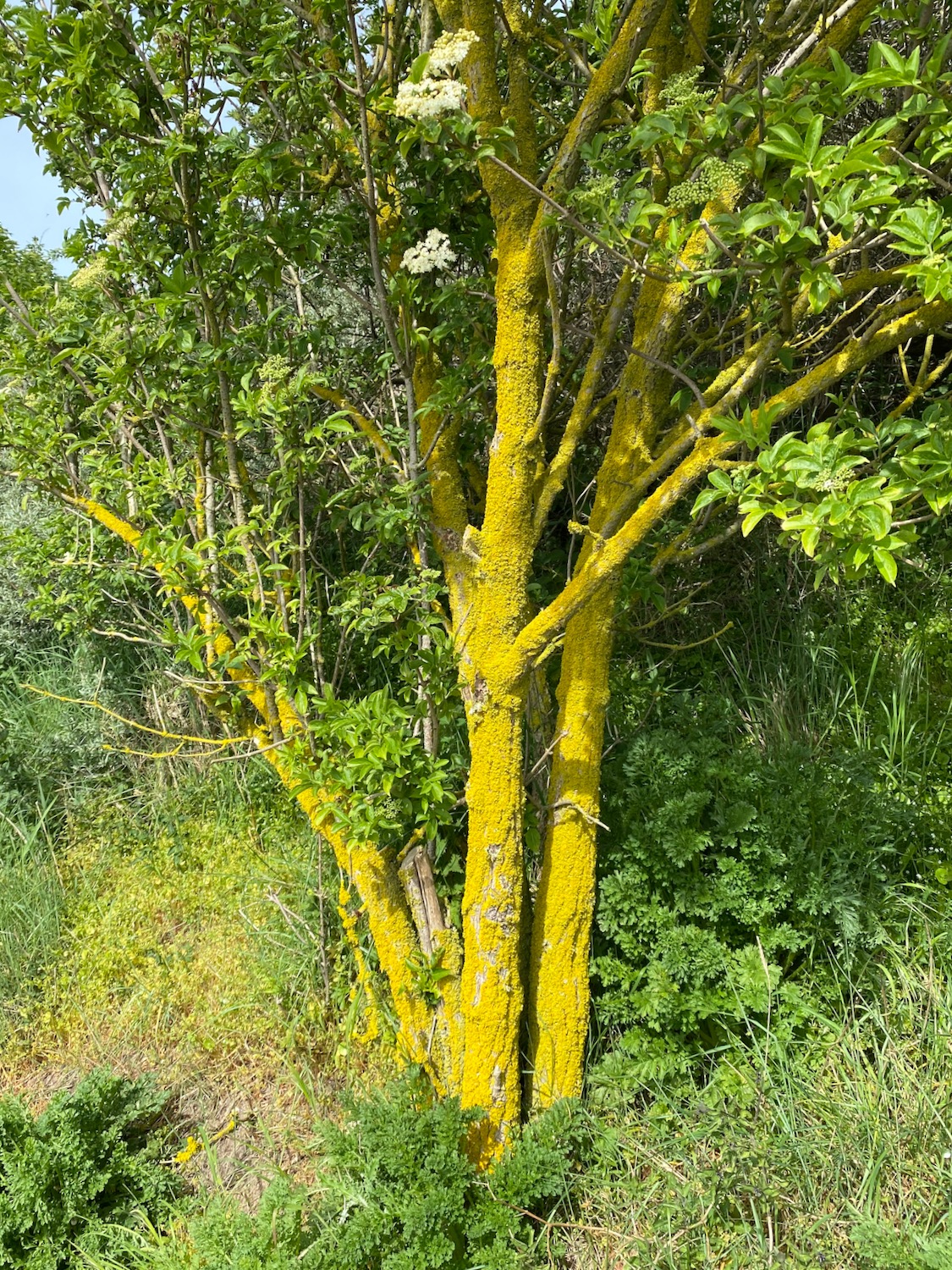 It’s a nice change to be walking through trees and bushes after the many miles of promenade. We stop to admire the lurid colour of this tree – some kind of lichen I suppose.
