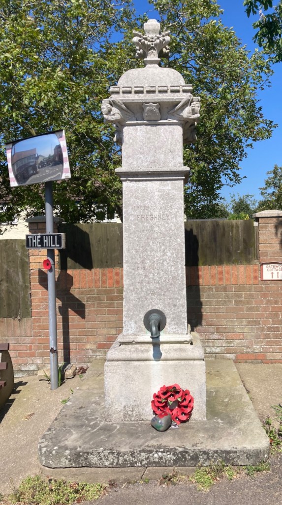 We start in front of the small war memorial, which has seen better days, and walk up past a caravan site heading for the marshes.