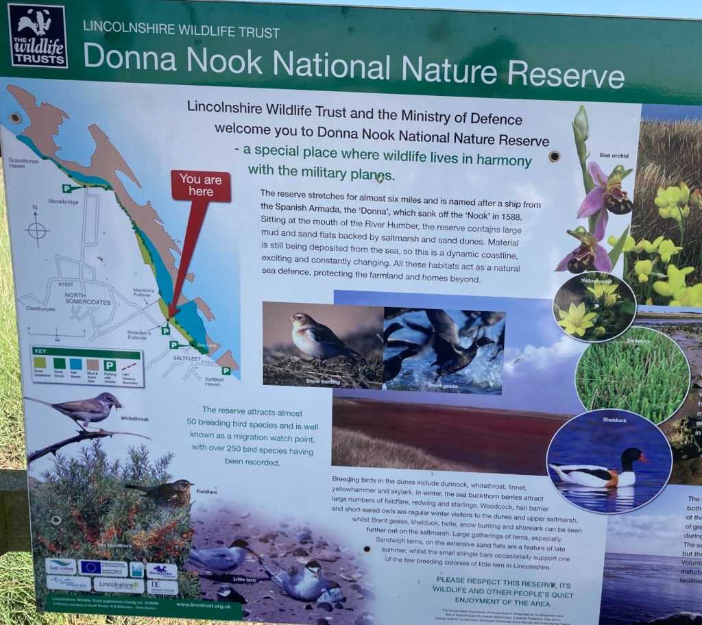 An information board tells us where we are – “a special place where wildlife lives in harmony with the military planes”. Strangely enough it doesn’t mention seals – I do know that Donna Nook has a resident seal colony – they return each year in the autumn to give birth. What a strange place to choose to have their young, under the roar of military aircraft dropping bombs.