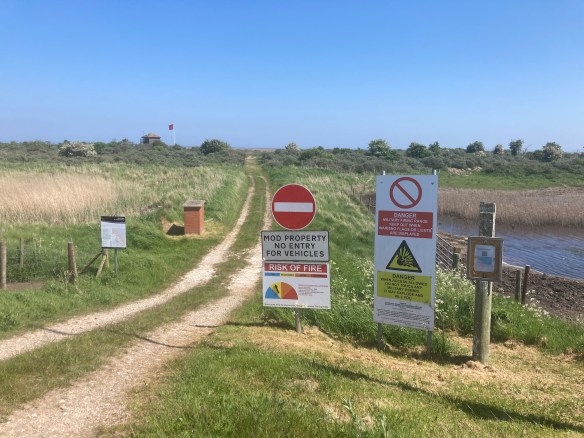 At one point the path moves inland a little to avoid a stretch of water and lead us away from what is marked on the map as a Danger Area in big red capital letters. Shortly after we come to our first hurdle – our way is blocked and in no uncertain terms. There is a road leading inland but that doesn’t look too inviting, and another track off to the right which leads up to a control tower where a red flag is flying. What to do?