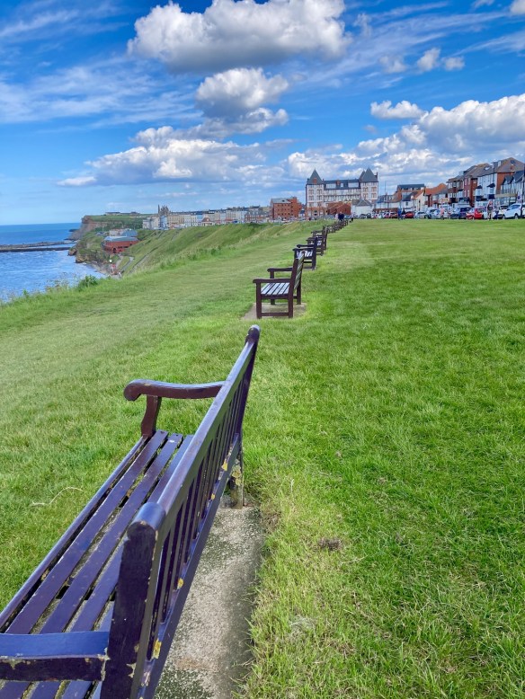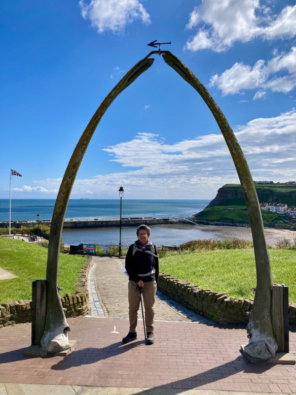 So……..hoping we might find a cafe on the other side of the harbour, we walk past the funfair and up the hill to the Whalebone Arch in the direction of Sandsend, a village three miles away.