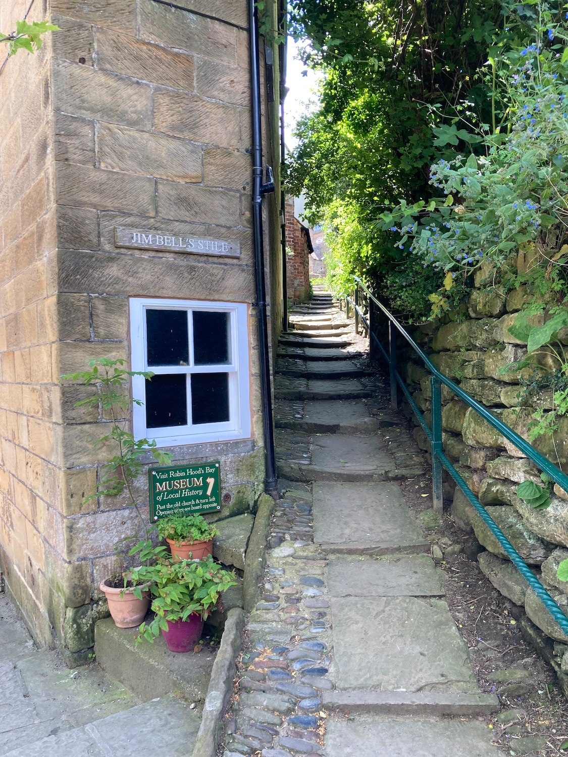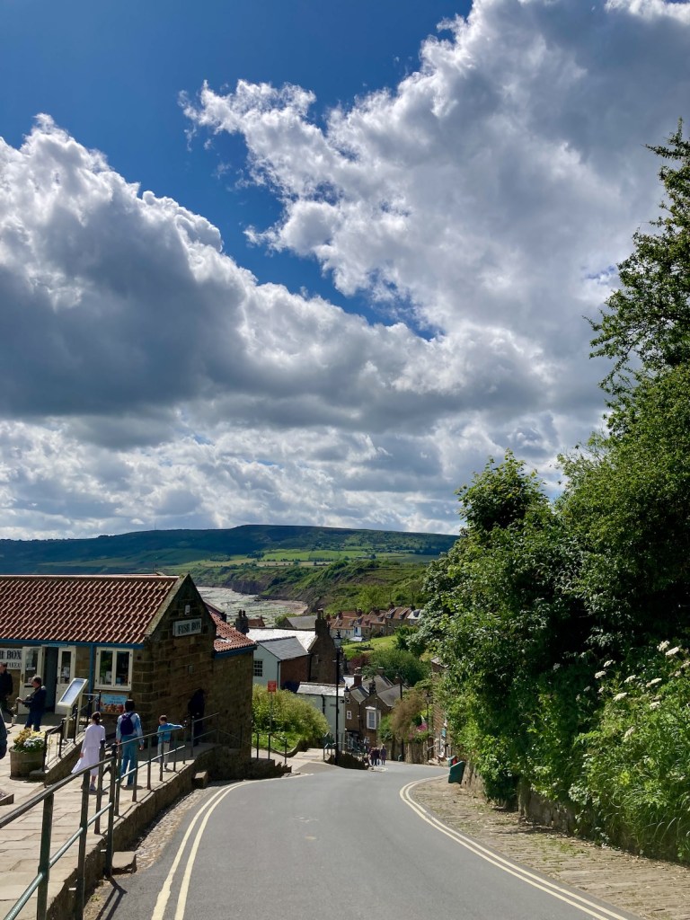 Thankfully we are now back in a county with efficient public transport and the bus from Whitby to Robin Hood’s Bay only takes thirty minutes. Access to the bay is down a very steep narrow road and even though our path leads off the top of the village we decide to walk down to have a look and buy some provisions..