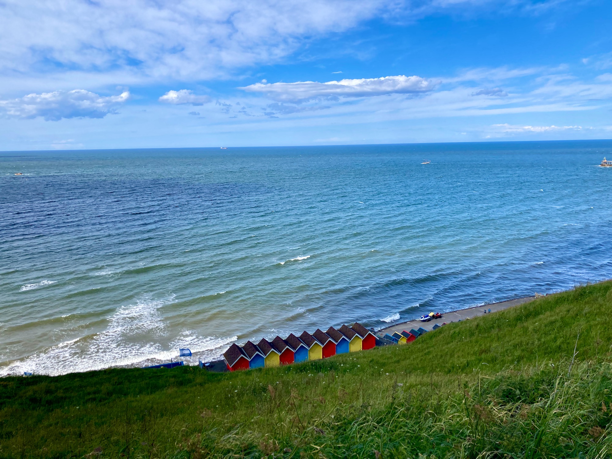 Down below a pretty row of beach huts catches my eye, making me think there could be a way of walking closer to the sea, but it’s too late now – I’m following the path on the OS map