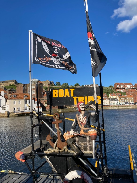 But Whitby is not our destination today so we walk quickly past all the small shops selling jWhitby Jet jewellery and pirate costumes, trying to find place for a quiet cup of tea. In the harbour there are numerous outfits offering pirate boat trips (whatever they might be) and an extraordinary amount of fish and chip shops but not really what we’re after.