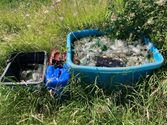 Beside the path – someone has dutifully collected empty glass bottles and plastic waste but who will collect them?