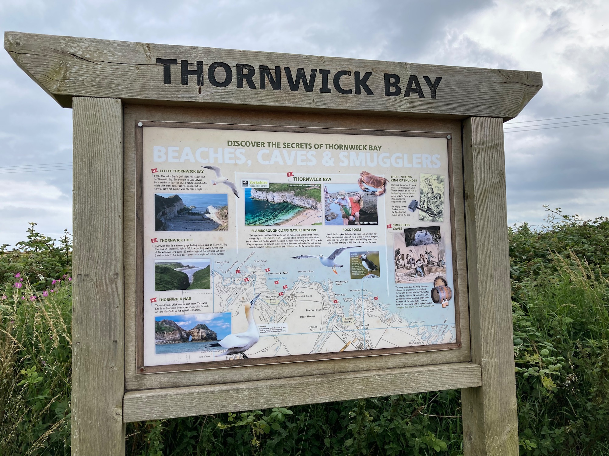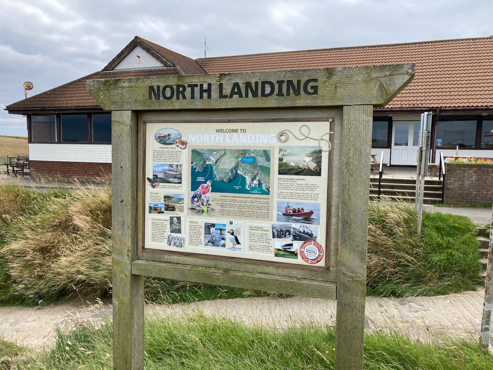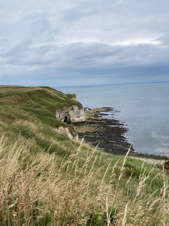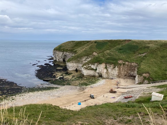 Damian is back and we’re heading south again to North Landing, located on the north side of Flamborough Head. It is part of a nature reserve and as such has a cafe, a carpark, toilets and information boards. The beach is accessed down a steep narrow path but that’s not where we’re going. It’s nice to see chalk cliffs again.