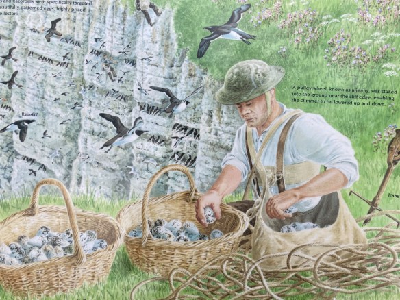More information boards describe the practice of “climming” – scaling down the cliff face to raid nests for eggs. I presume the hard hat is to lessen the impact of a sudden dive bombing by angry birds. Brave men…..