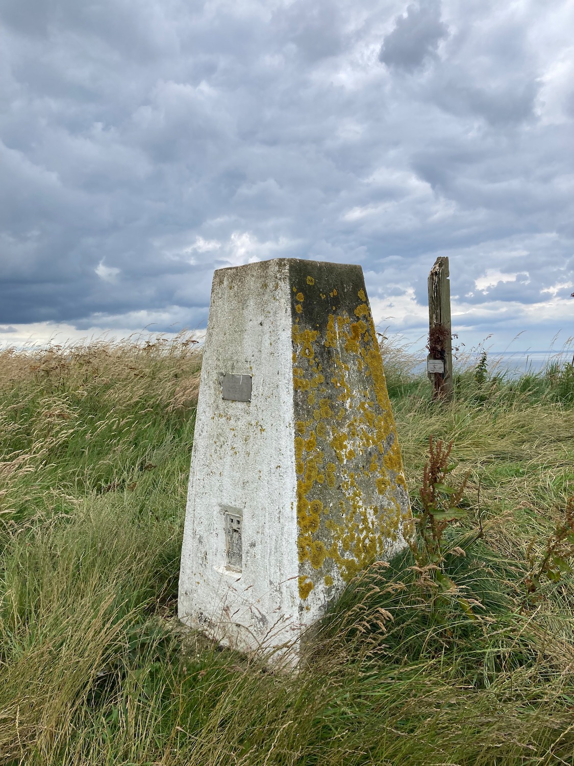 But it’s time to move on – by now we are a little peckish and although we pass quite a few benches, there are still too many people around. The path now leads us away from the cliff edge, winding round in a loop called Low Fields. After what seems like a very long time we decide to stop for lunch at the next half acceptable spot, which happens to be a triangulation point – the highest point for miles around – although it doesn’t feel very high.