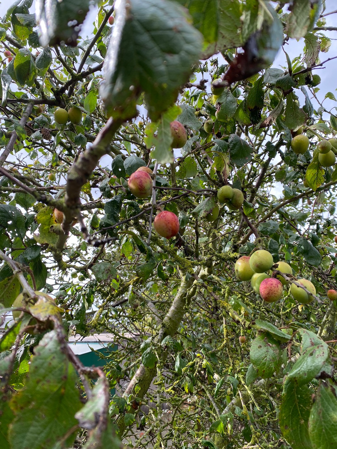 Our route is now through the village and down to the holiday park known as Sand-le- Mere, where I know there is an easy way down to the beach. We find the back entrance and ignoring the sign, climb over the gate to find ourselves in a pleasant caravan site with its own fruit trees.