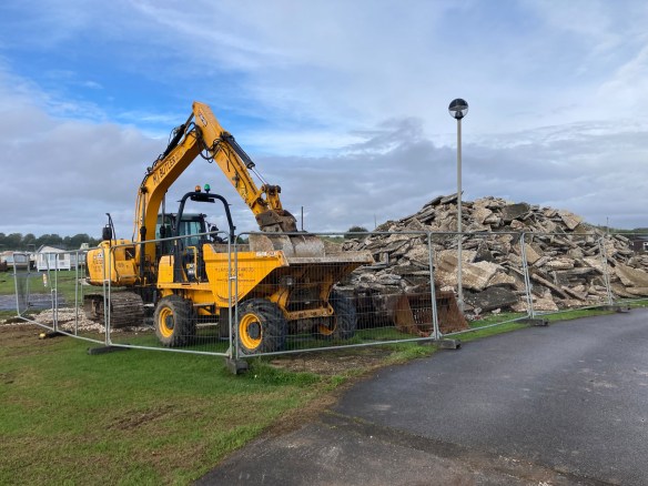 The bus from Hornsea drops us off at the caravan site where the road falls into the sea. Concrete foundation pads have been broken up, leaving patches of mud which bear witness to the removal of caravans back from the edge. A digger waits for the next one.