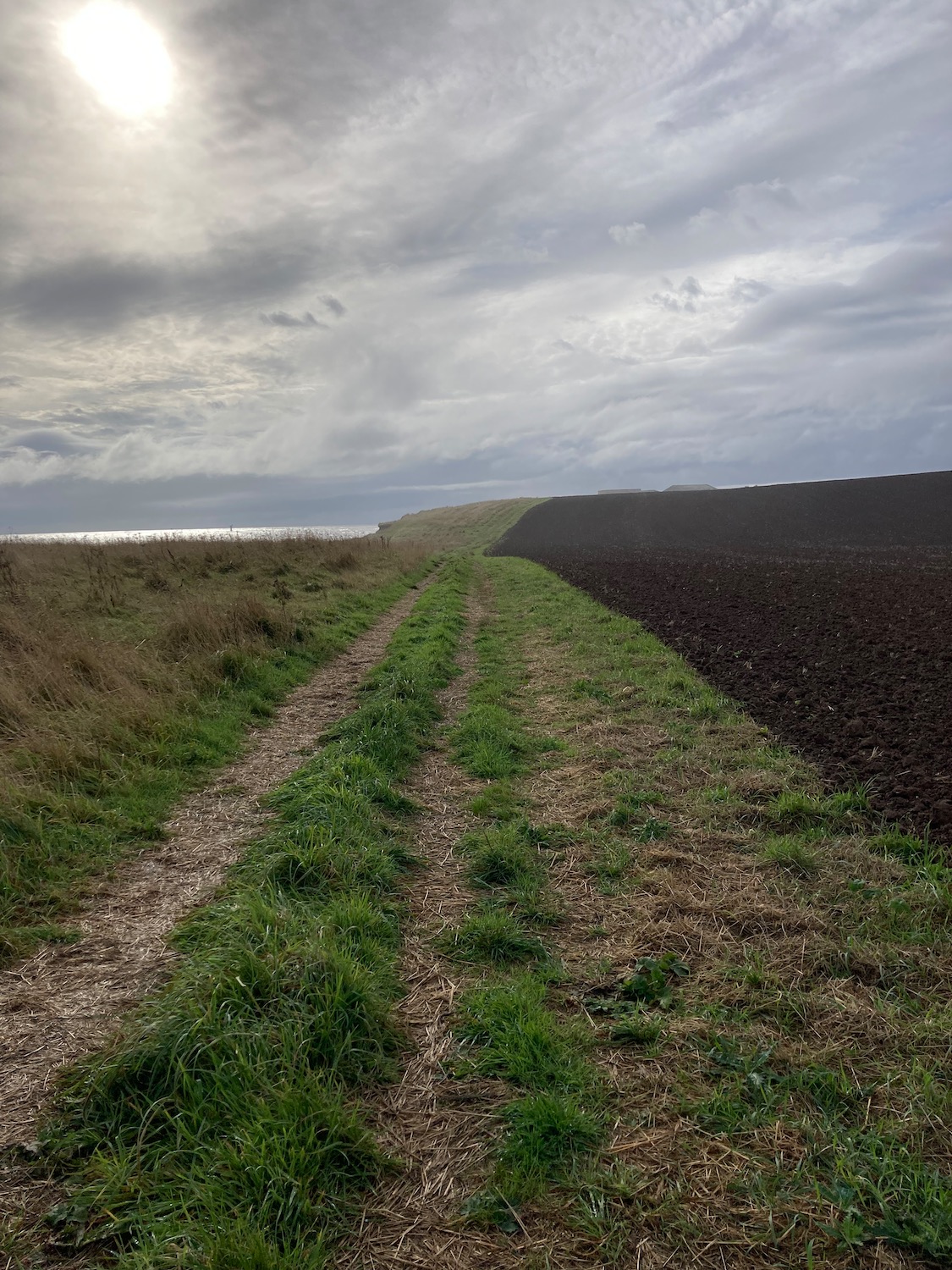 We carry on walking along the edge of vast ploughed fields until we reach an actual obstacle that requires some thought.