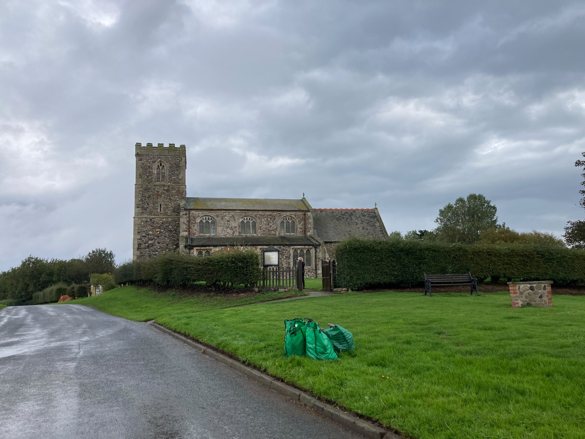 After this bit of excitement there are no more physical barriers to our progress but then it does decide to rain – heavily. We walk head down, along the perimeter of the Grimston Garth parklands which are not open to the public and on to Monkwith, where we leave the coast and head inland to Tunstall. It is time for lunch but we need somewhere dry with a bench if possible. Tunstall Church comes into view and we make for the porch but some bright spark has thought it necessary to remove the benches so we are assigned to the cold floor. Oh well……