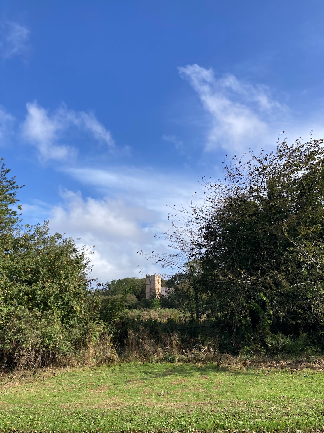 After a mile or so of road walking the sky has brightened and it is a little less windy – The tower of Holmpton Church can be seen above the trees to the right of us.
