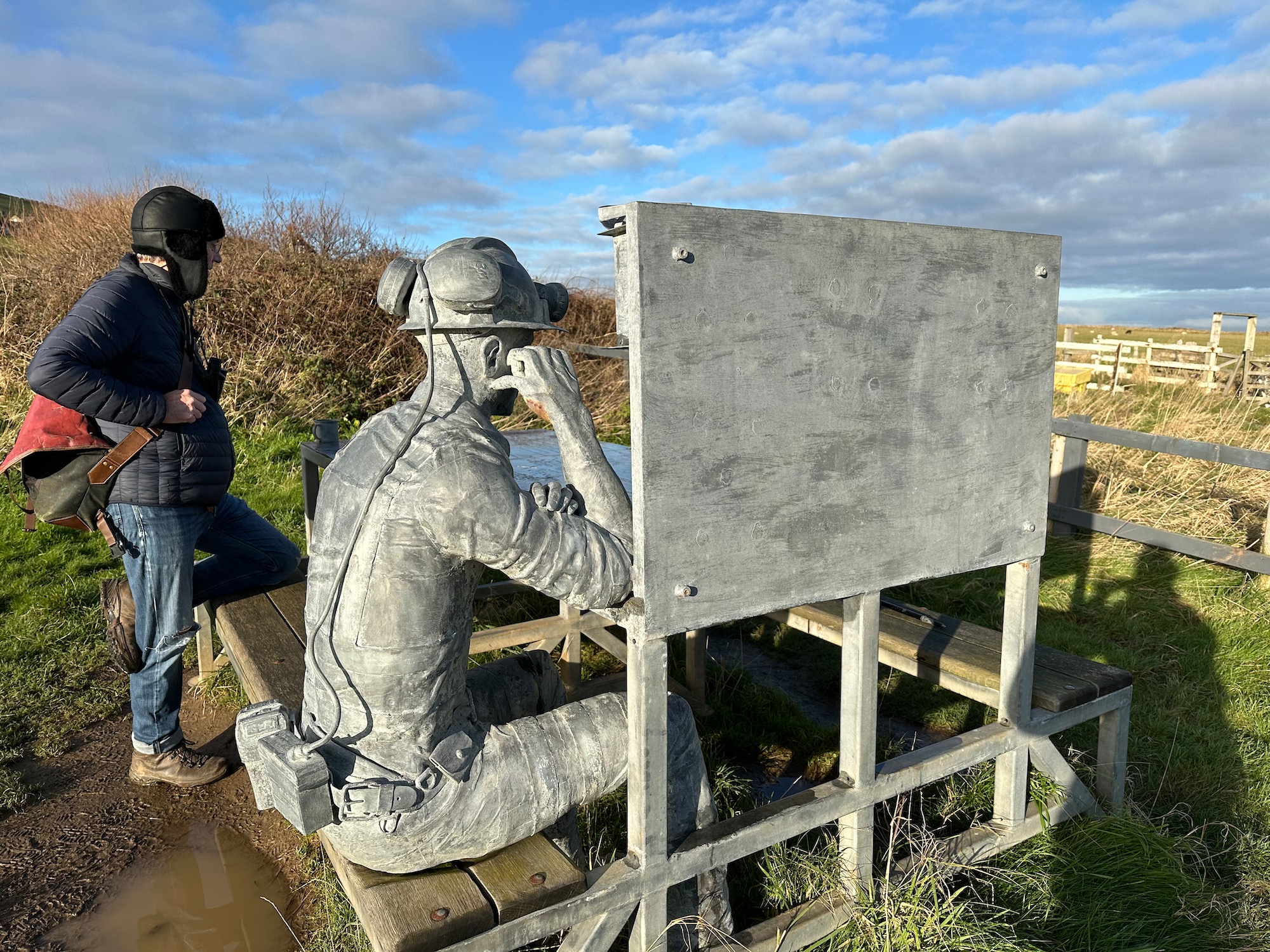 At the top of the climb we turn right, through a gate and on to the rough ground of the cliffs. Not long after, we stop to examine this piece of public art. The work of a local artist, the piece is made of galvanised steel and was designed to commemorate fifty years of existence for Boulby Mine, a 1,400 meter deep mine, opened in 1974 to exploit seams of potash (fertiliser) and rock salt for icy roads. The sculpture depicts a miner sitting at a “Bait Table” – “bait” being the slang word for a miner’s lunch pack. These tables are movable and can be placed at various different locations around the mine. We are told that under our feet lies a network of underground tunnels, 1,000 kms in length and an underground laboratory for the investigation of Dark Matter – all very Phillip Pullman. Boulby Mine has now stopped mining potash and salt and has turned its attention to the production of Polyhalite (another fertiliser) from a deep seam 1.5kms out to sea. It takes miners seven minutes to travel in a lift to the bottom of the mine.