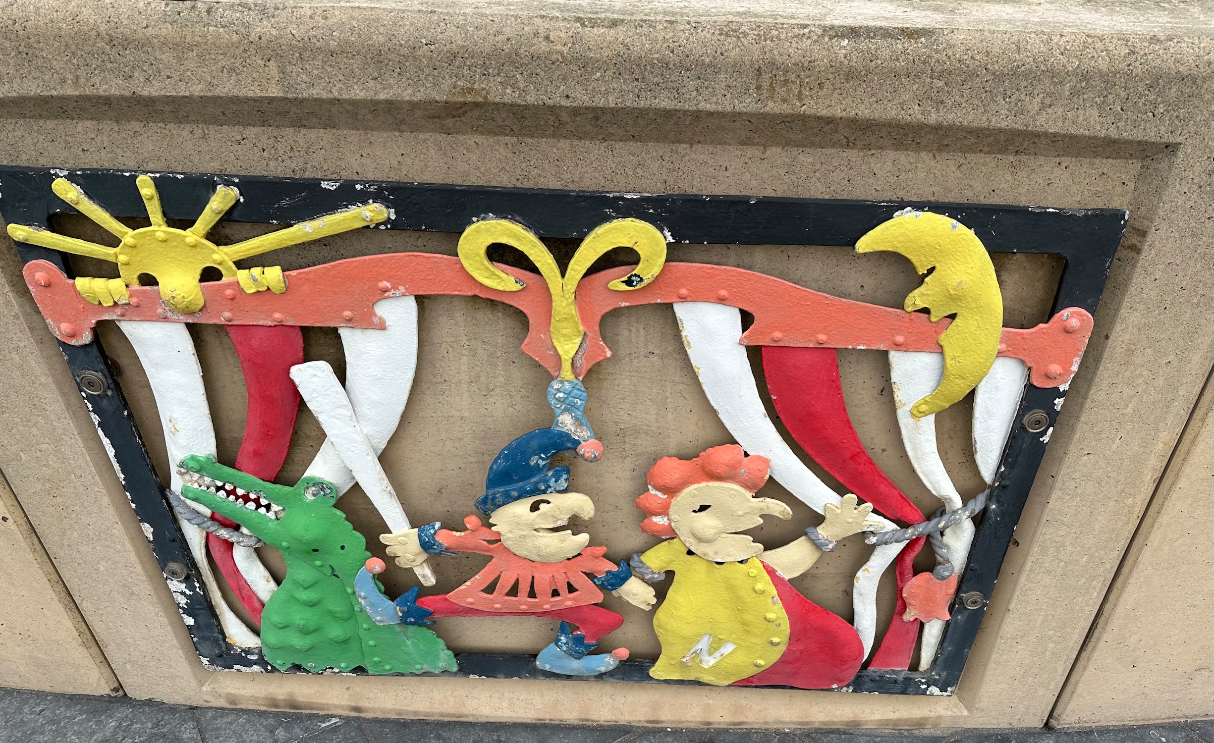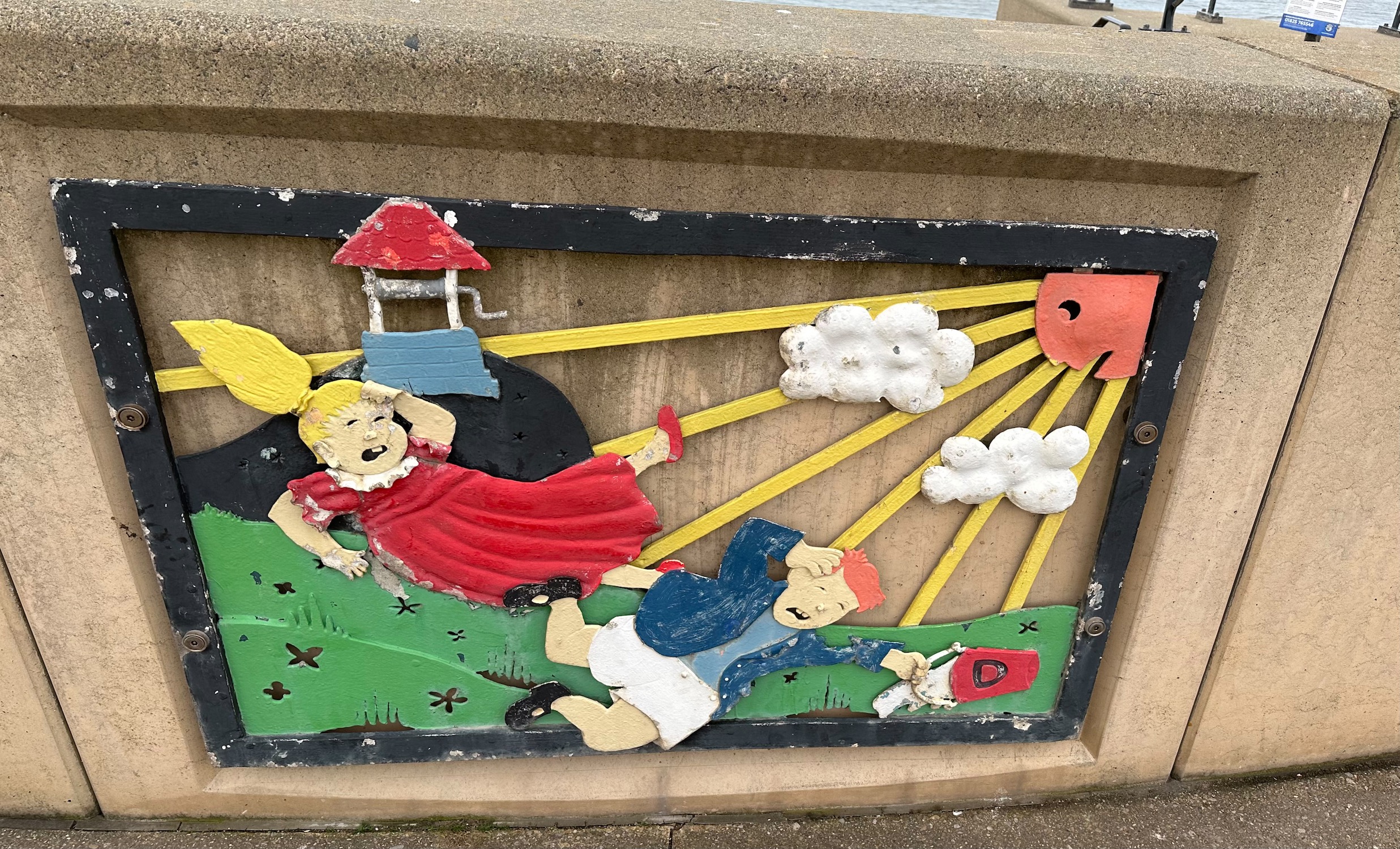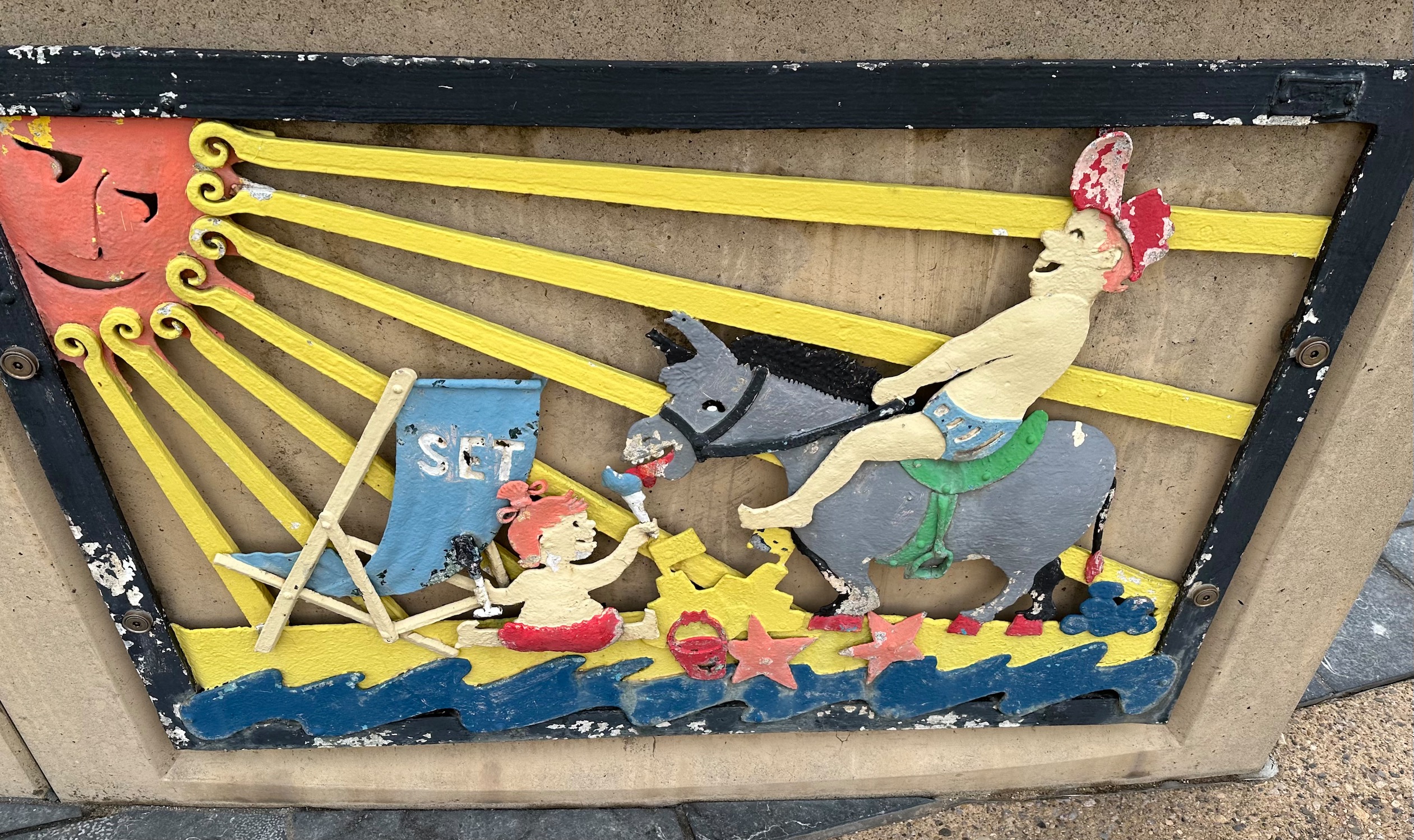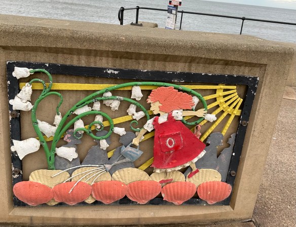 A little further on we meet the first of a series of delightful, brightly painted, metal relief panels, mounted in the 90’s. As well as well known nursery rhymes, there are also those depicting summer holidays on the beach for families from the industrial cities of the north. I can’t stop taking photographs of them but I should have been down on my knees to take the pictures to correct the slant.