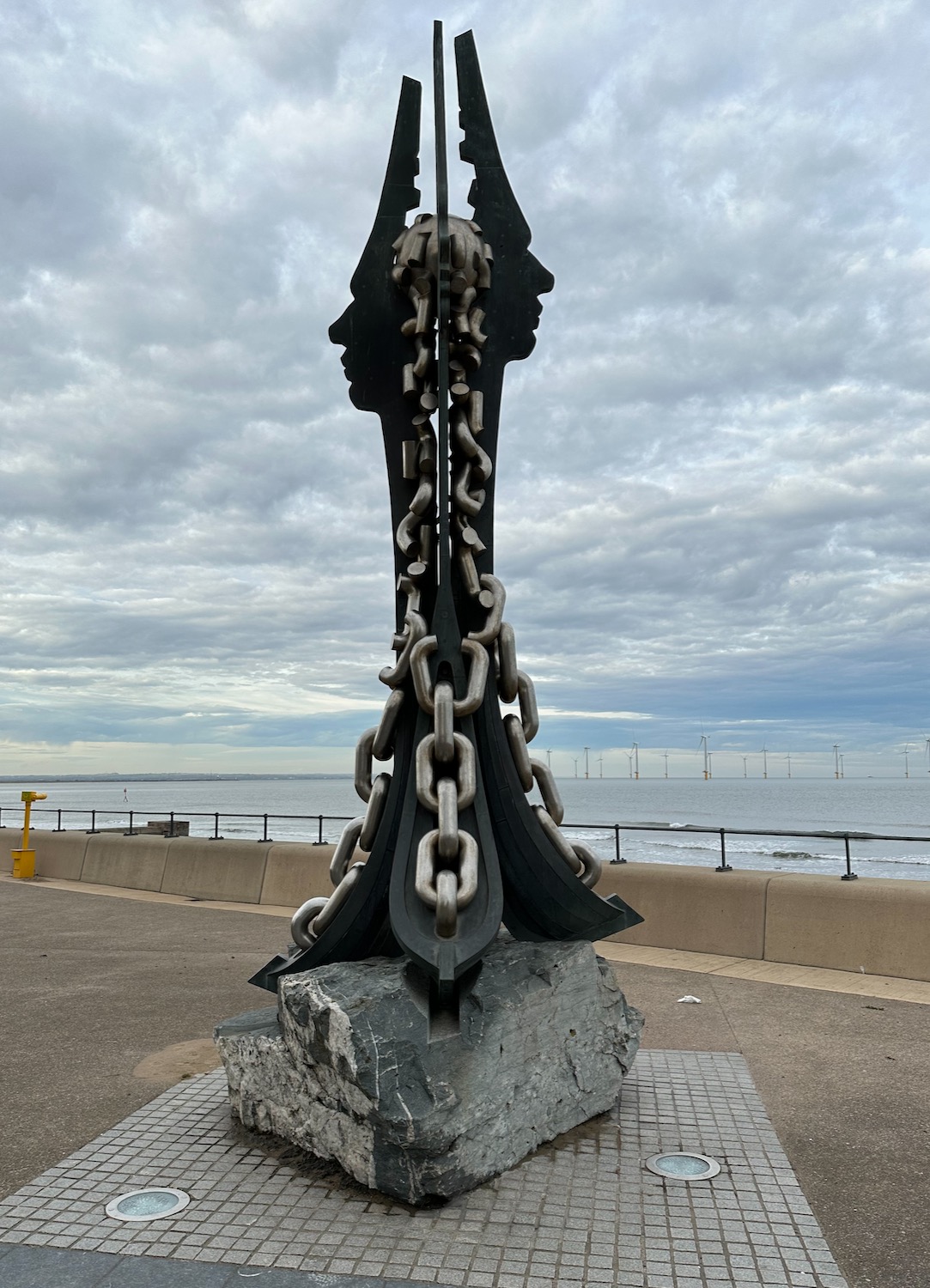 Entitled Sinterlation, the sculpture features four boats and four large steel chains to represent the town’s relationship with its fishing fleet and nearby steel works. The name of the sculpture comes from sinter, a granulated material applied to the top of a blast furnace.