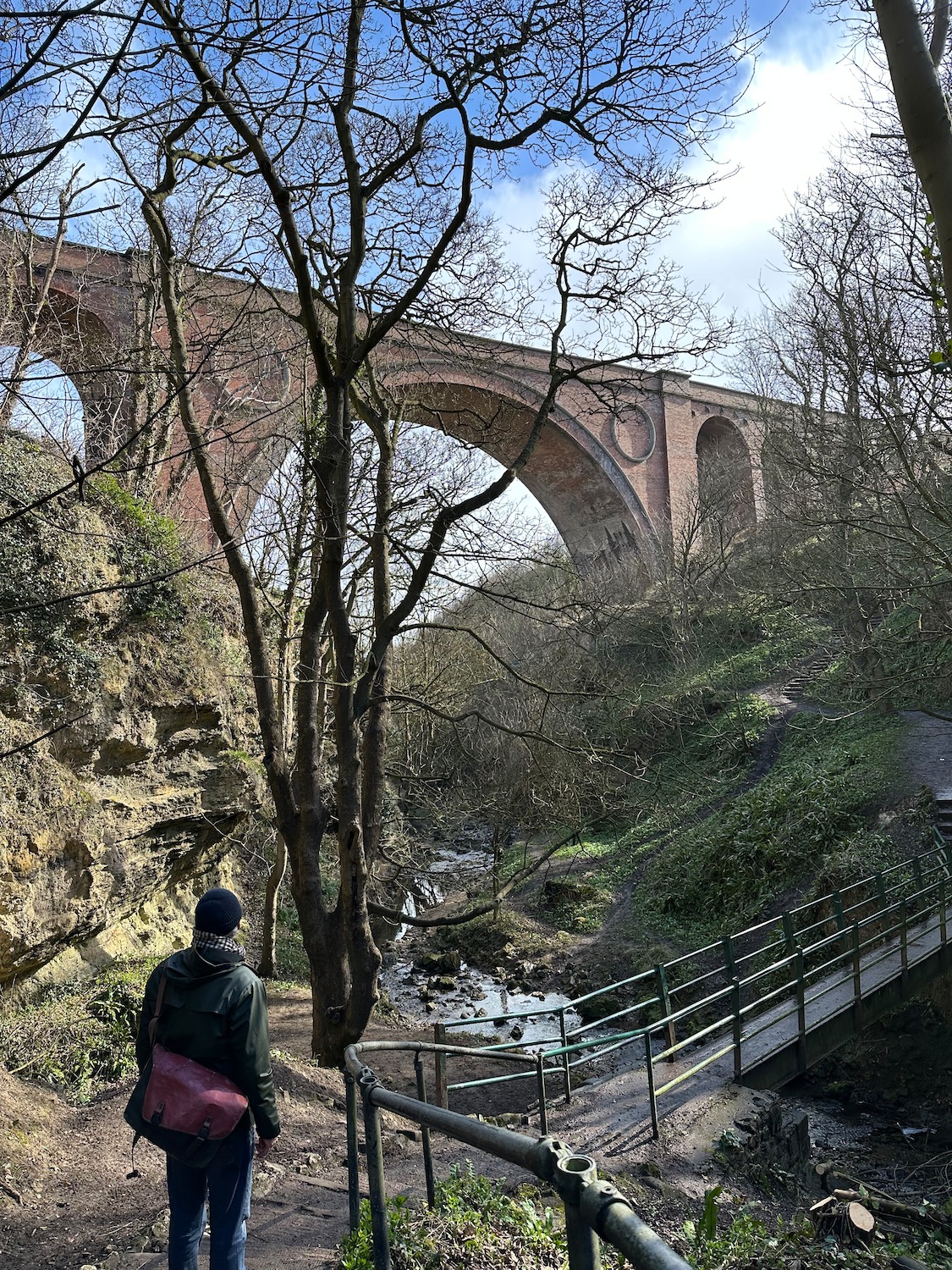 And suddenly, out of the blue, (as it were) a beautiful red brick viaduct appears, straddling a busy stream marked on the map as Hawthorn Burn. We take a moment to marvel ……