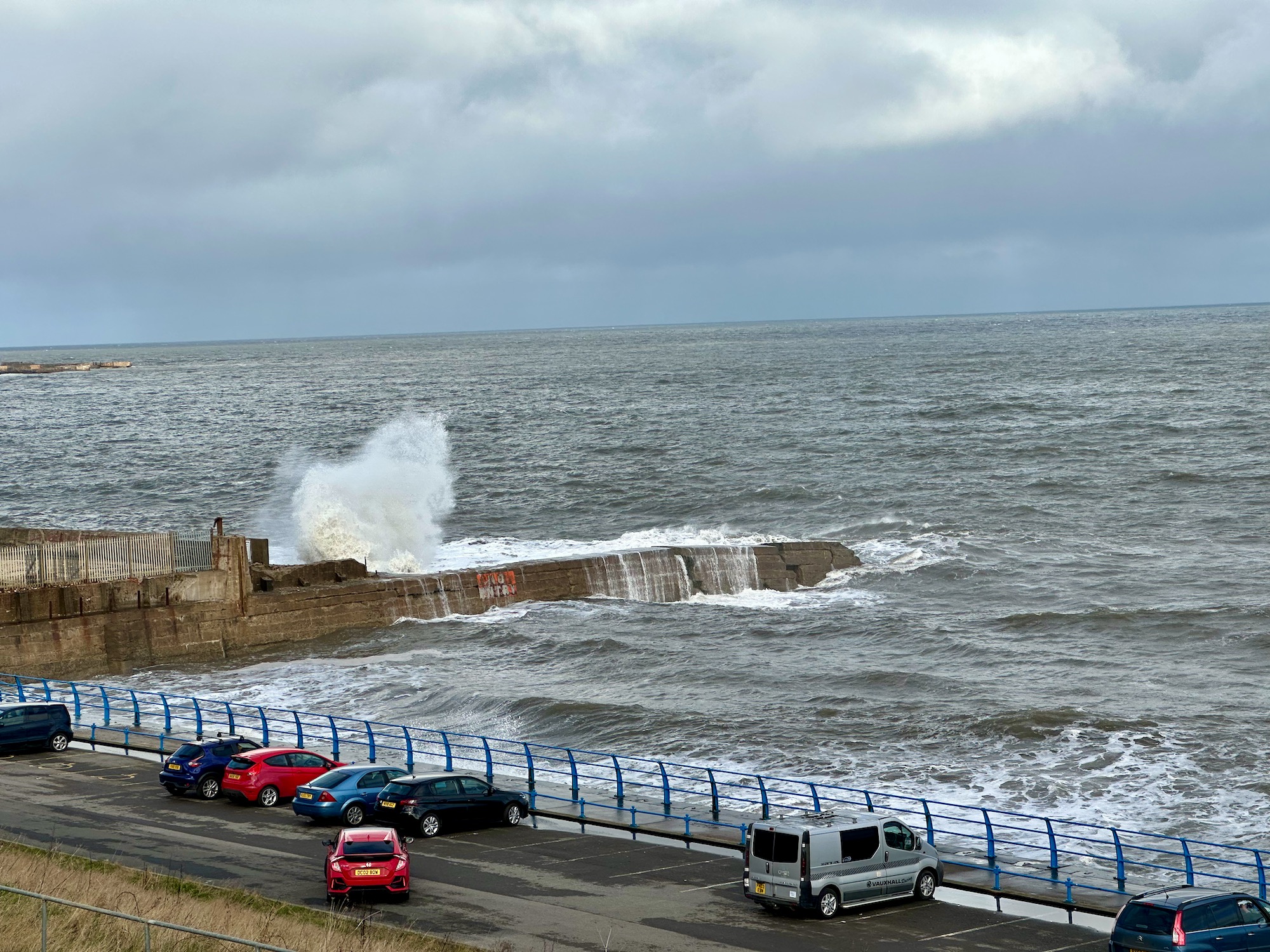 We are now approaching Sunderland and the landscape flattens out as we arrive at Hendon Beach. Further up the coast, people sit in their cars watching the waves pound against the harbour wall .