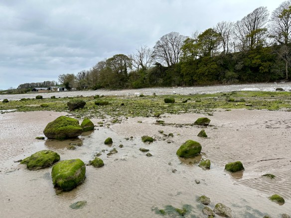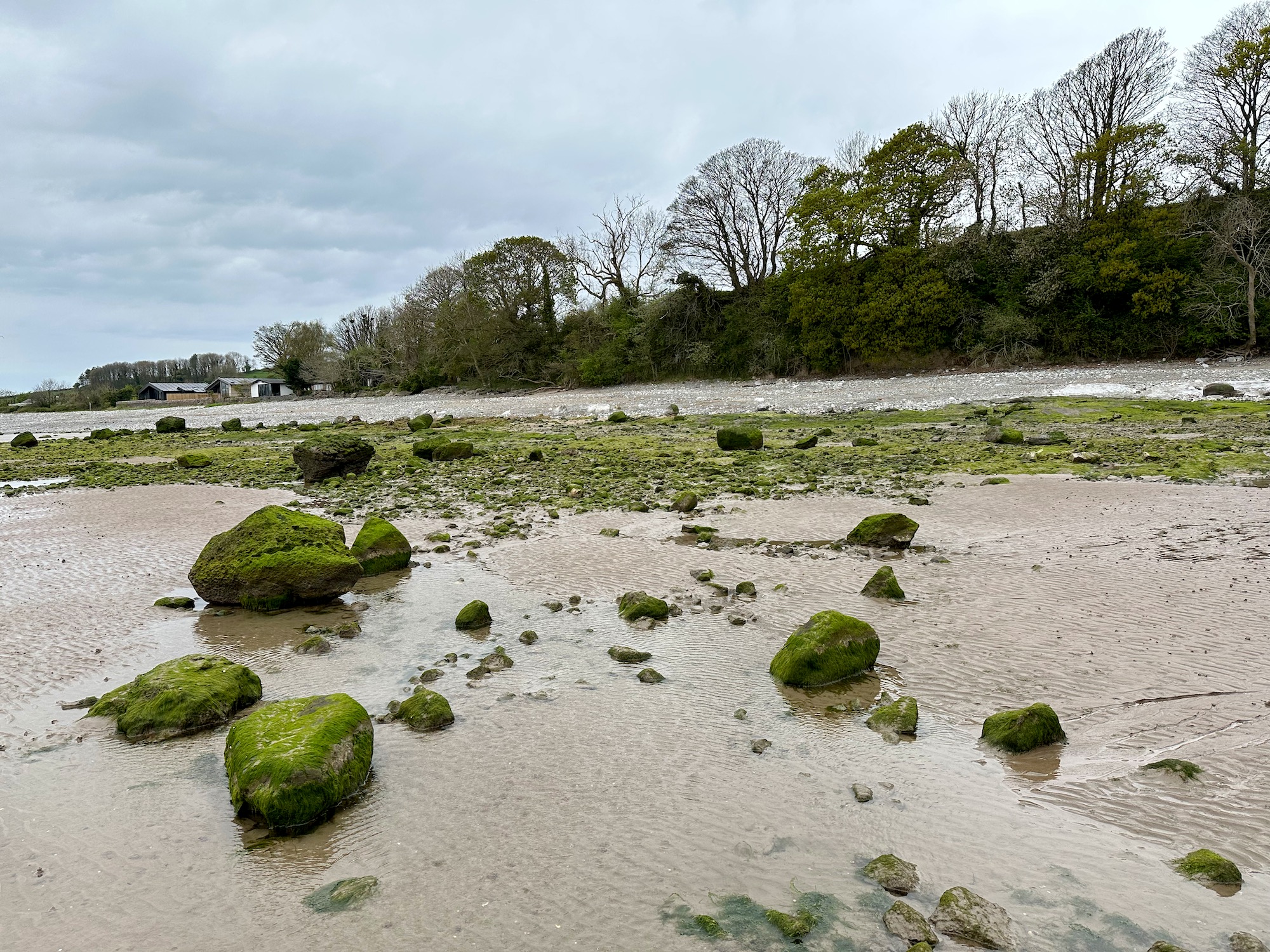 The path ends here so we now have to choose between walking on the shingles/pebbles at the back of the beach or the muddy sands with the occasional patches of slimy slippery boulders. We choose the latter as the pools of water are shallow and not high enough to sneak over the tops of our boots. In fact the water is so far away that the easiest way is to head out to sea across the deserted sands.